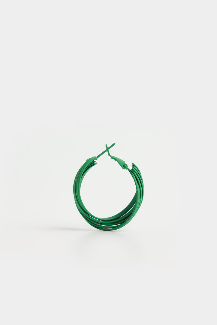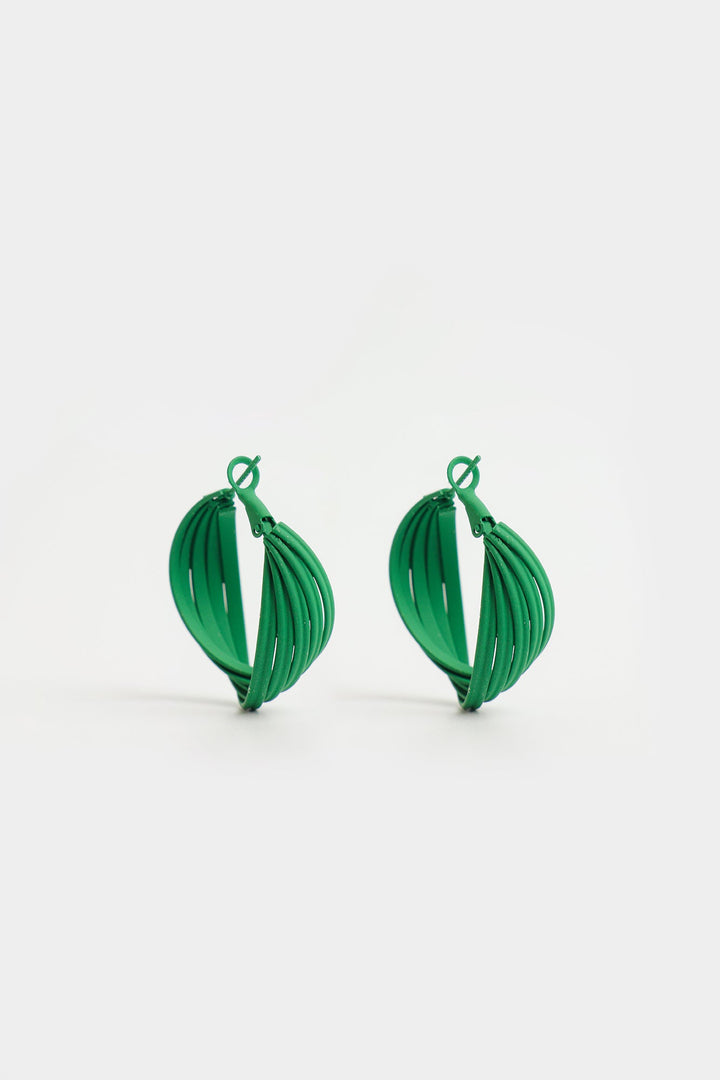The earrings in the image are unique hoops with a layered design. Each earring consists of multiple thin green bands arranged in a curved, stacked formation, giving the hoops a textured, dimensional appearance. The vibrant red color and layered structure add a modern, bold twist to the classic hoop earring style.