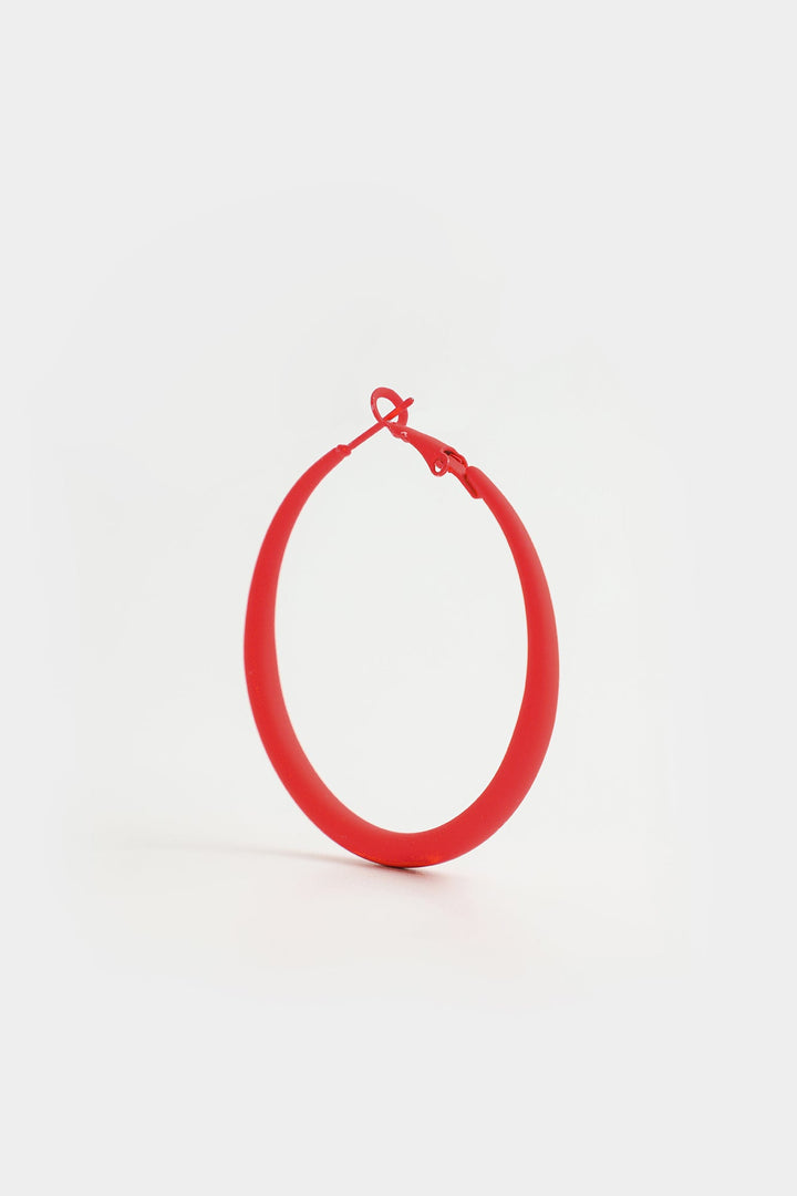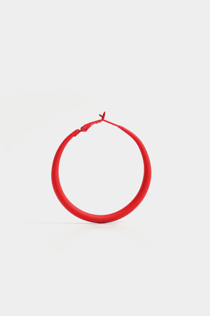 The earrings in classic circular shape, with a smooth and solid finish in a bright red color. These hoops appear to be medium to large in size and are likely made of lightweight material, designed for casual wear or to add a vibrant touch to a minimalist outfit.