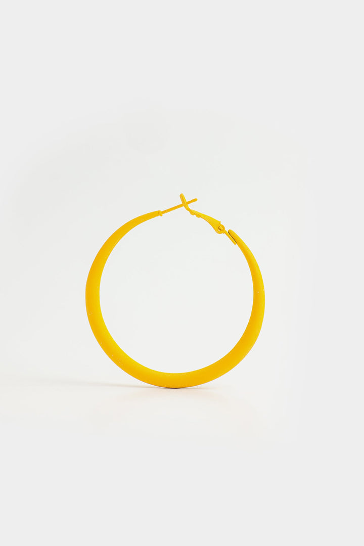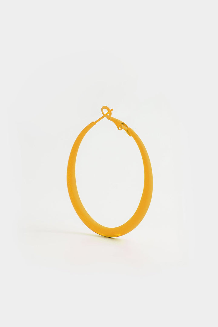 The earrings in classic circular shape, with a smooth and solid finish in a bright yellow color. These hoops appear to be medium to large in size and are likely made of lightweight material, designed for casual wear or to add a vibrant touch to a minimalist outfit.