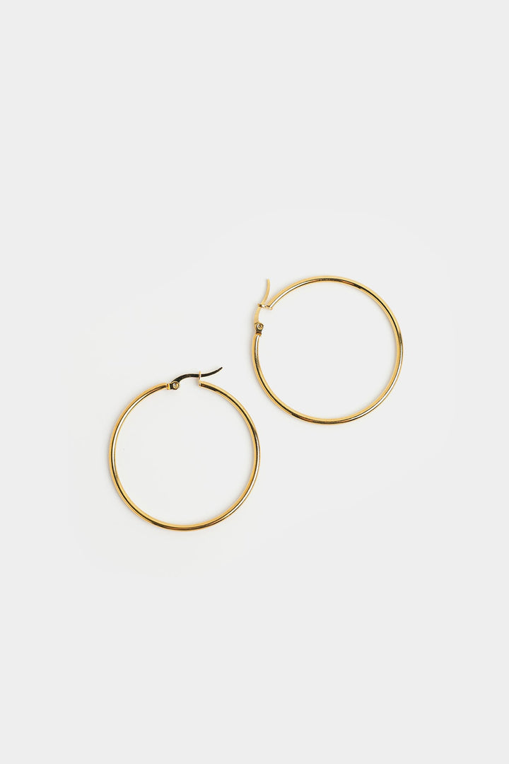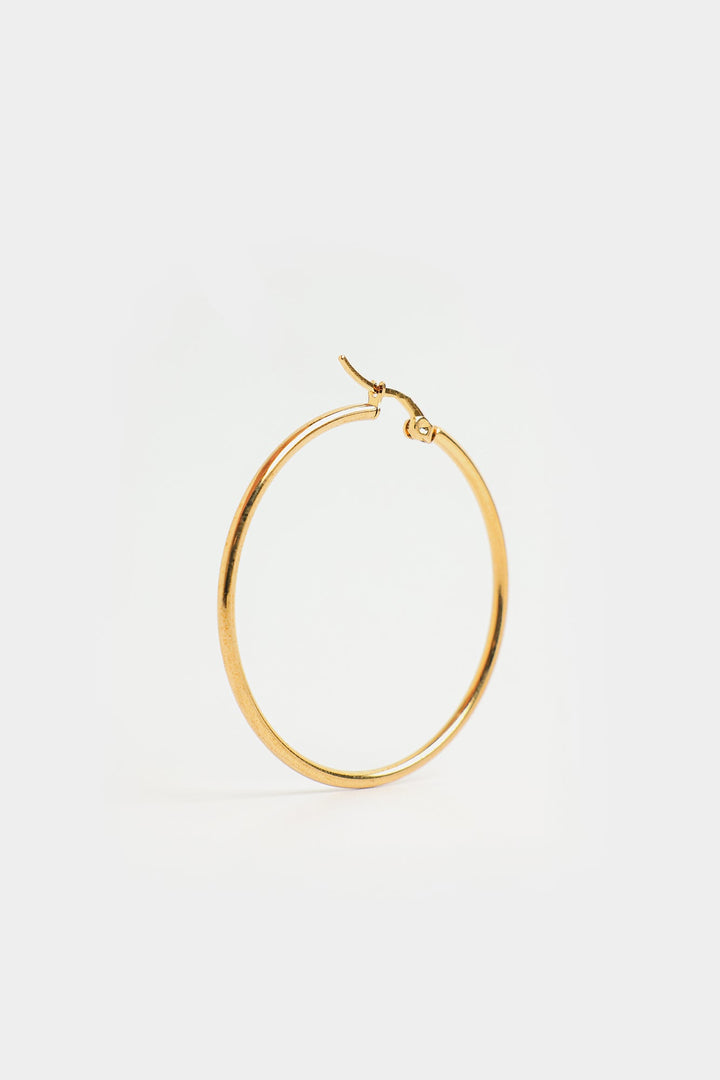 This is a sleek, classic gold hoop earring with a smooth, polished surface. The hoop is thin and lightweight, offering a minimalist and elegant design that can complement any style. The simplicity of the earring makes it a timeless accessory for everyday wear or special occasions.