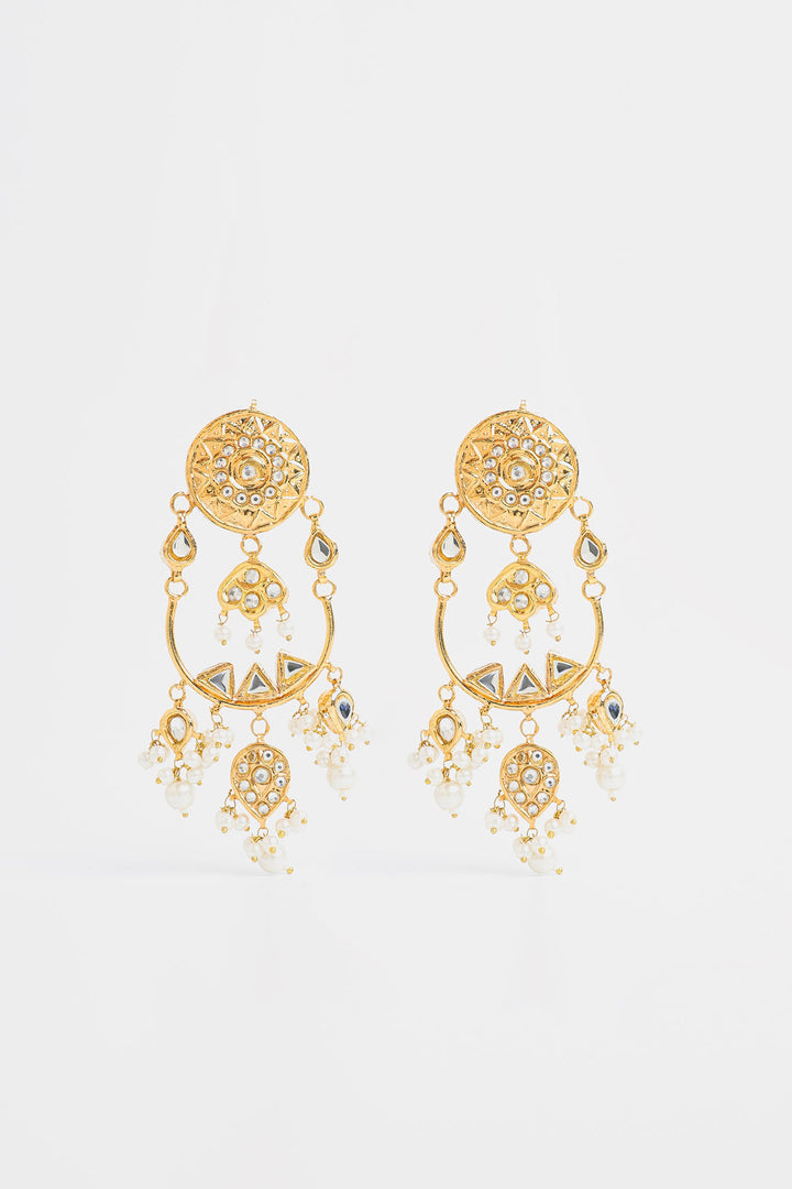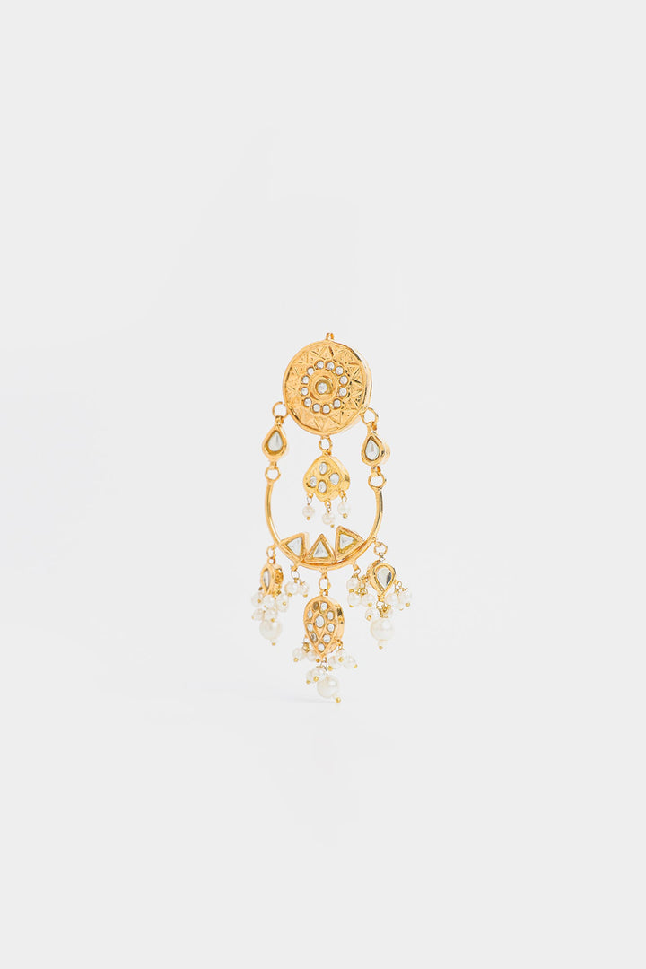 The earrings have a round, ornate stud at the top, Two interconnected hoops Small triangular or teardrop-shaped embellishments accentuate the design, and the earrings are adorned with dangling pearl-like beads, Making them ideal for weddings, cultural celebrations, or special occasions.