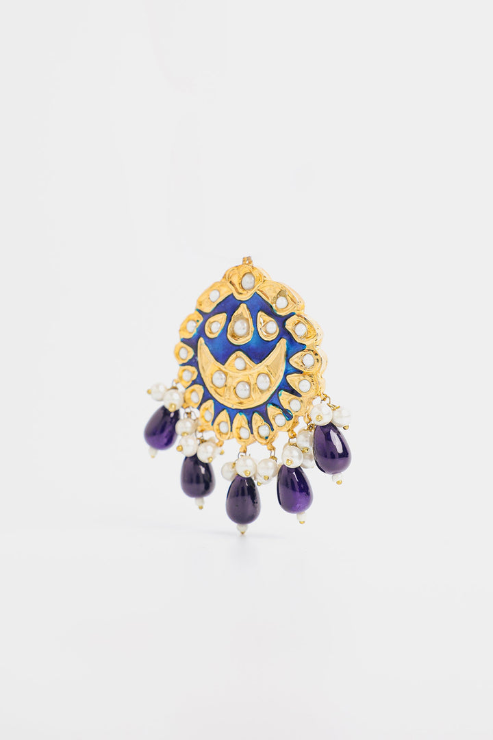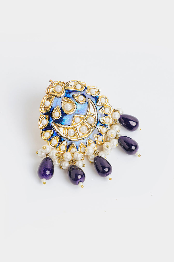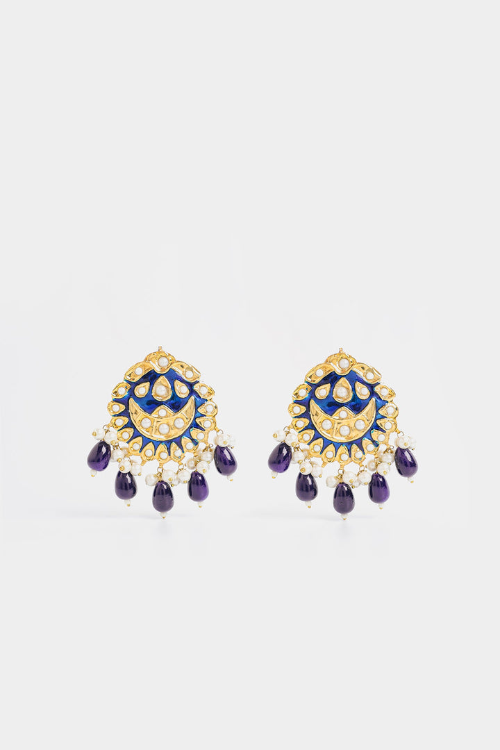 The earrings with a striking crescent moon motif at the center. The design features a royal blue enamel background, adorned with pearl-like embellishments arranged symmetrically. multiple dangling deep purple teardrop-shaped beads enhance the luxurious appeal, these earrings are perfect for festive occasions.