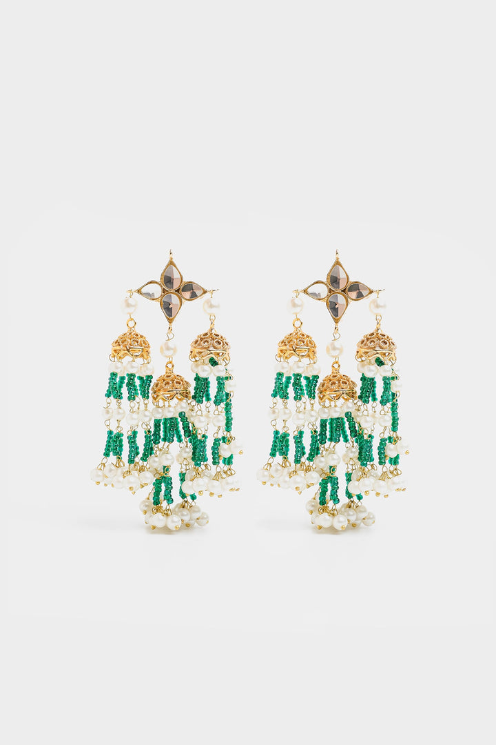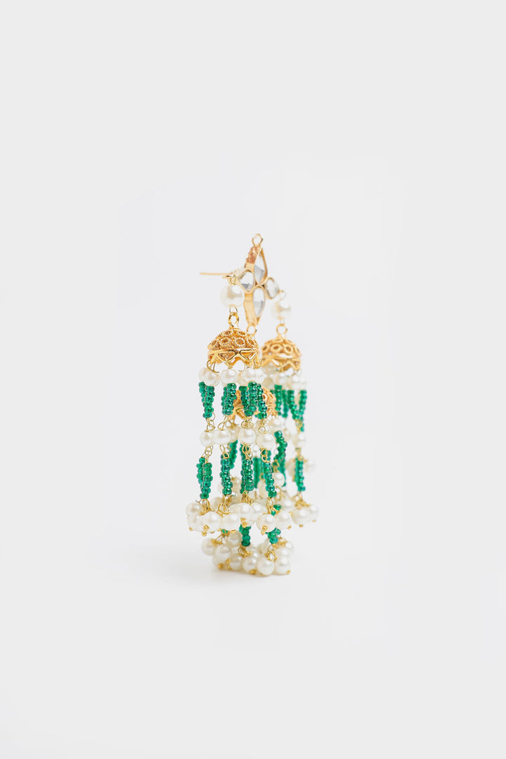 From the delicate stud at the top to the multiple layers of embellishments on the hanging jhumkas structure, these earrings exude elegance and tradition with kundun flower. The chandelier design features evenly spaced pearl-like white and green-colored beads, making them ideal for weddings and festive occasions.