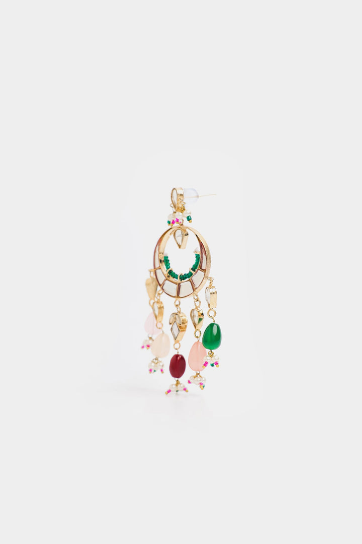 A pair of beautifully designed earrings with a circular shape. The earrings feature a gold-toned metal framework with intricate detailing resembling a crescent pattern. The design incorporates green and white kundan. A red accent provides a striking contrast to the overall design. These earrings are perfect for festive occasions.