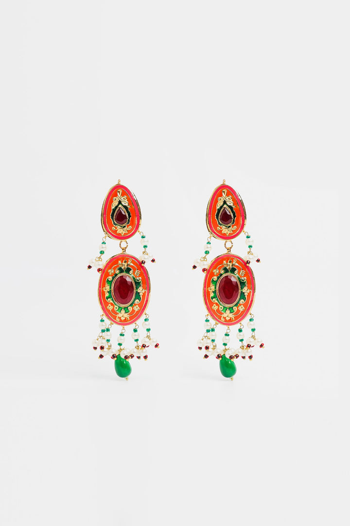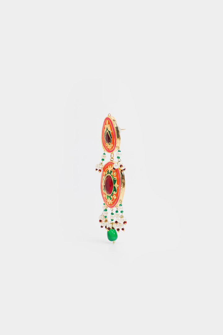 These earrings feature a two-tiered oval and teardrop-shaped structure with dominant red and green hues, accented by gold detailing. Small dangling beads in white, red, and green cascade from the lower section, with a larger green bead drop at the bottom. These earrings exude a bold and cultural charm, making them ideal for ethnic outfits, and festive occasions.