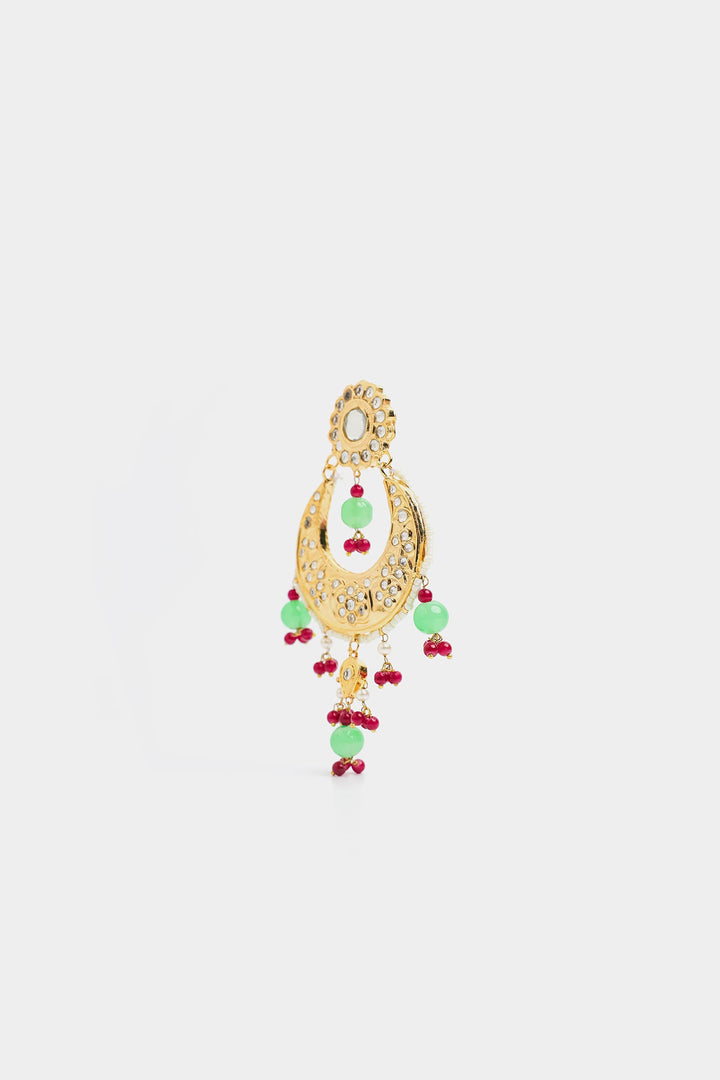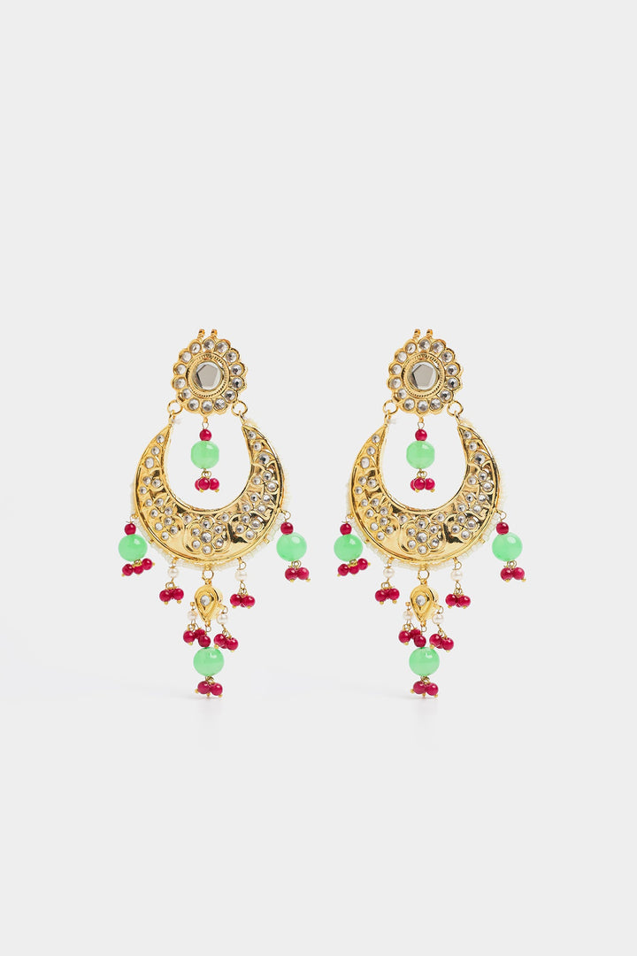 The earrings have a delicate stud at the top, leading to a hoop-like structure adorned with multiple layers of embellishments. The crescent is decorated with small, evenly spaced pearl-like red and mint-colored beads, adding an elegant and traditional touch. perfect for weddings, and festive occasions.