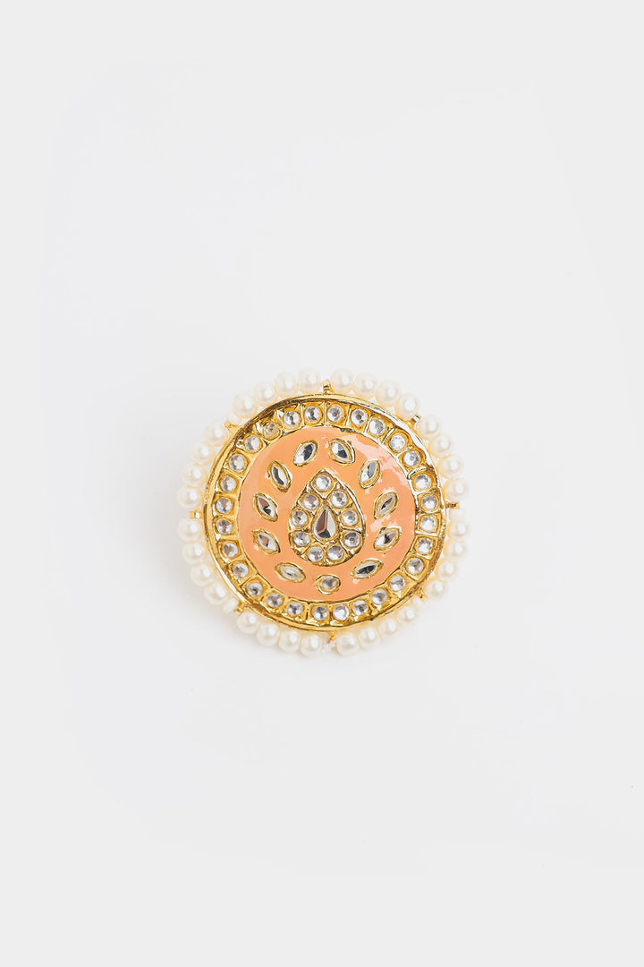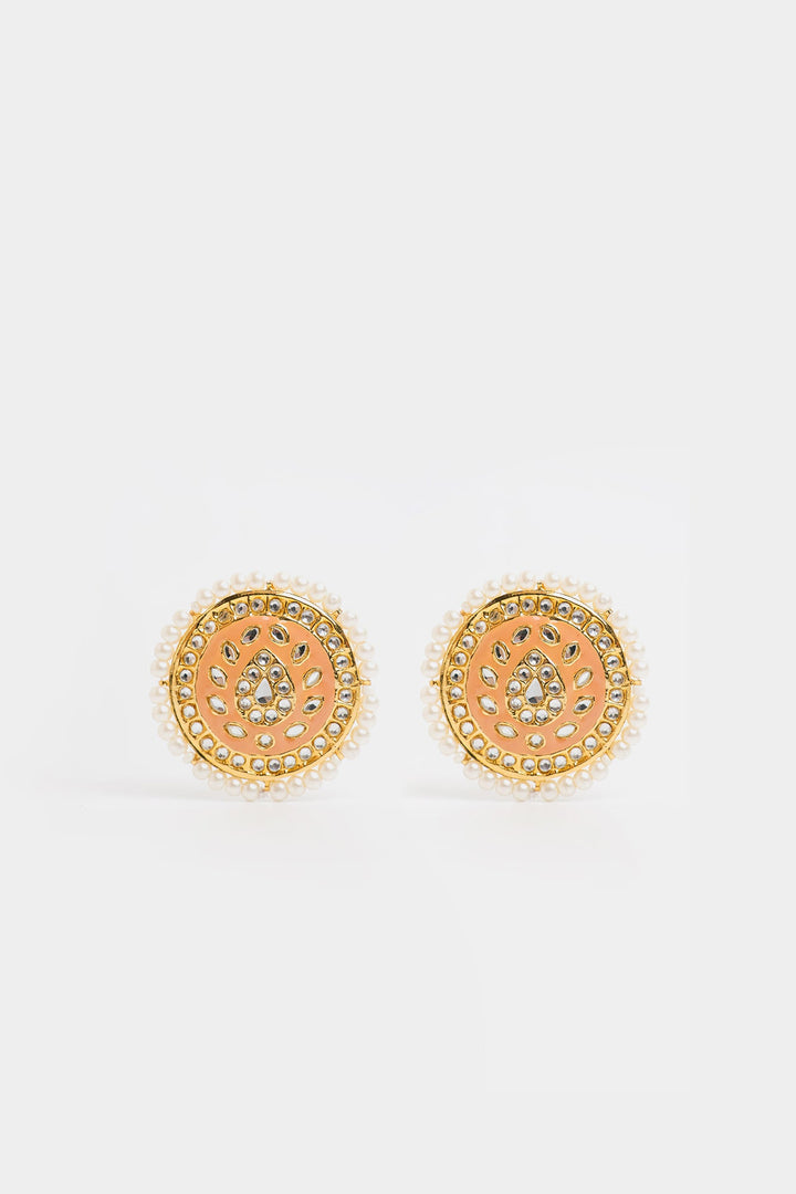 An elegant peach kundan stud with delicate white pearls adorning its perimeter. Perfect for any occasion, these earrings add a touch of sophistication and charm to any outfit. Handcrafted with the highest quality materials, these earrings are a must-have for every jewelry collection.