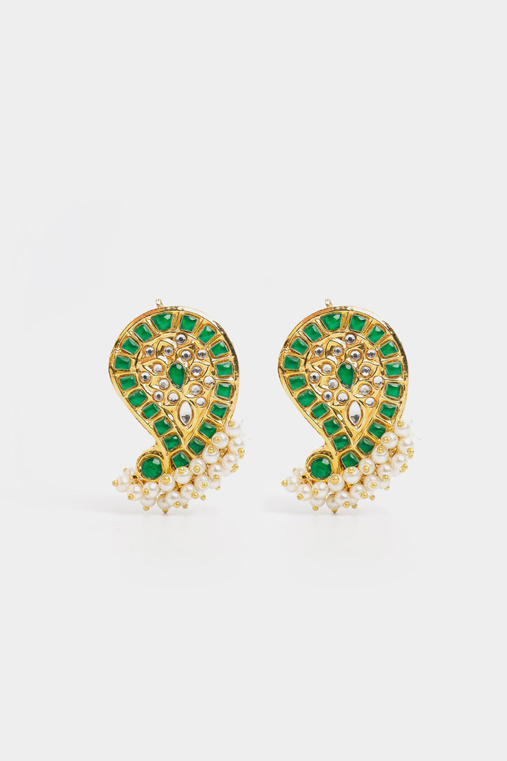Add a touch of elegance to any outfit with these paisley-shaped stud earrings. Featuring vibrant green stones and delicate white beads, these earrings are the perfect combination of subtle and statement. Expertly crafted for a sophisticated look, these earrings are sure to catch the eye.