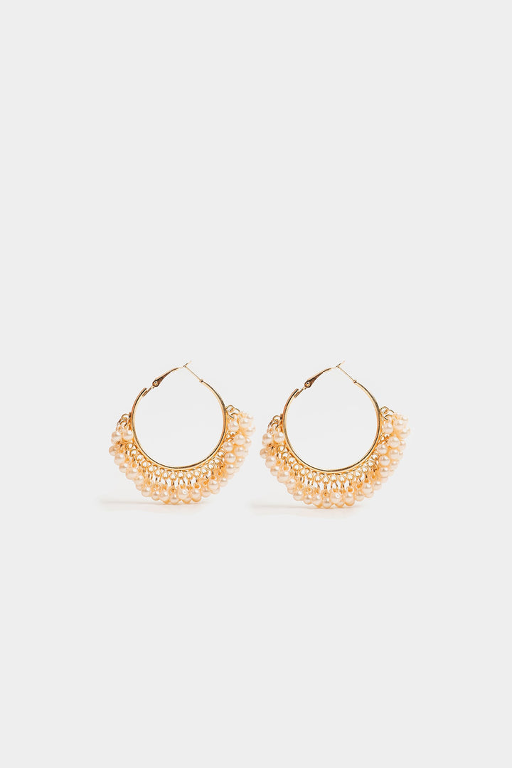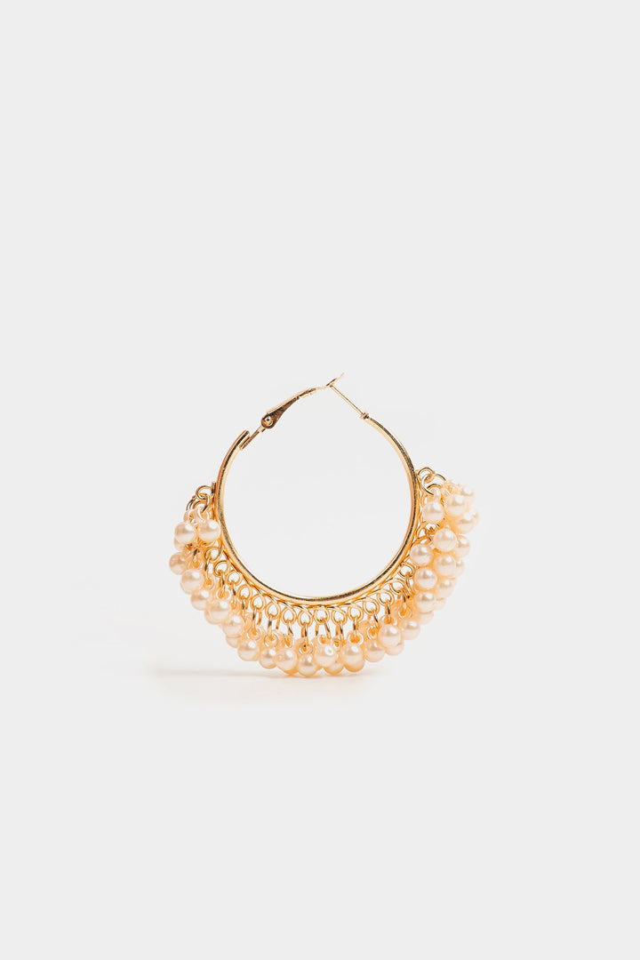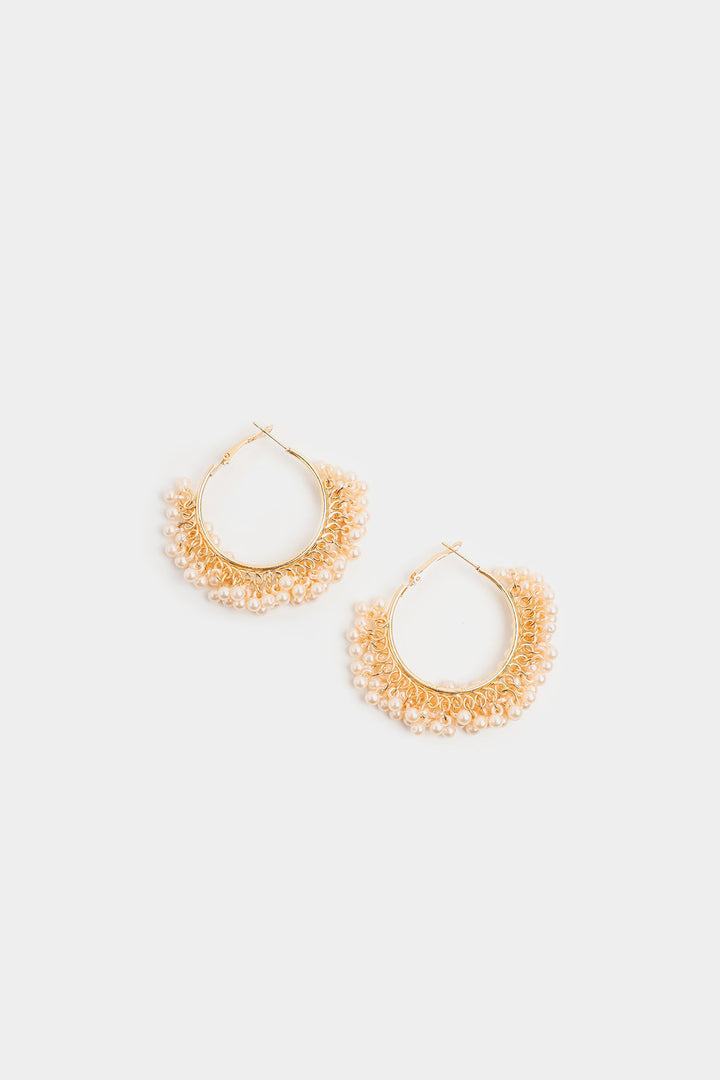 Make a statement with timeless beauty in these elegant golden hoop earrings. Delicately embellished with clusters of tiny pearls along the lower curve, they offer a graceful and sophisticated touch suitable for any occasion.