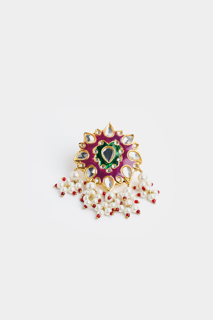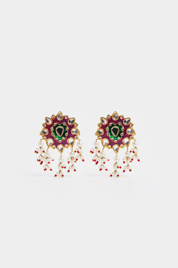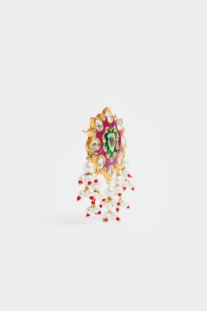 A floral design with a central teardrop-shaped mirror or stone inlaid in a green background. Surrounding mirror or kundan-style work in gold with a deep pink or magenta enamel base. Dangling pearls with red bead accents for a festive, ornate finish. Style these classy earrings and embrace the gorgeous look