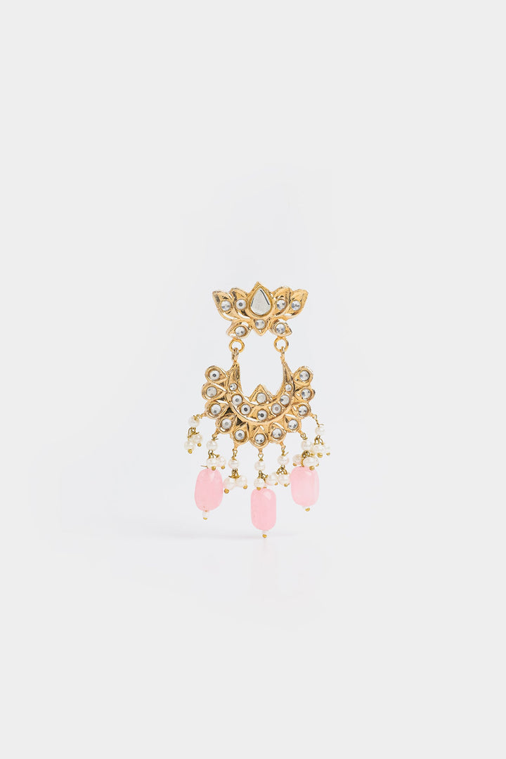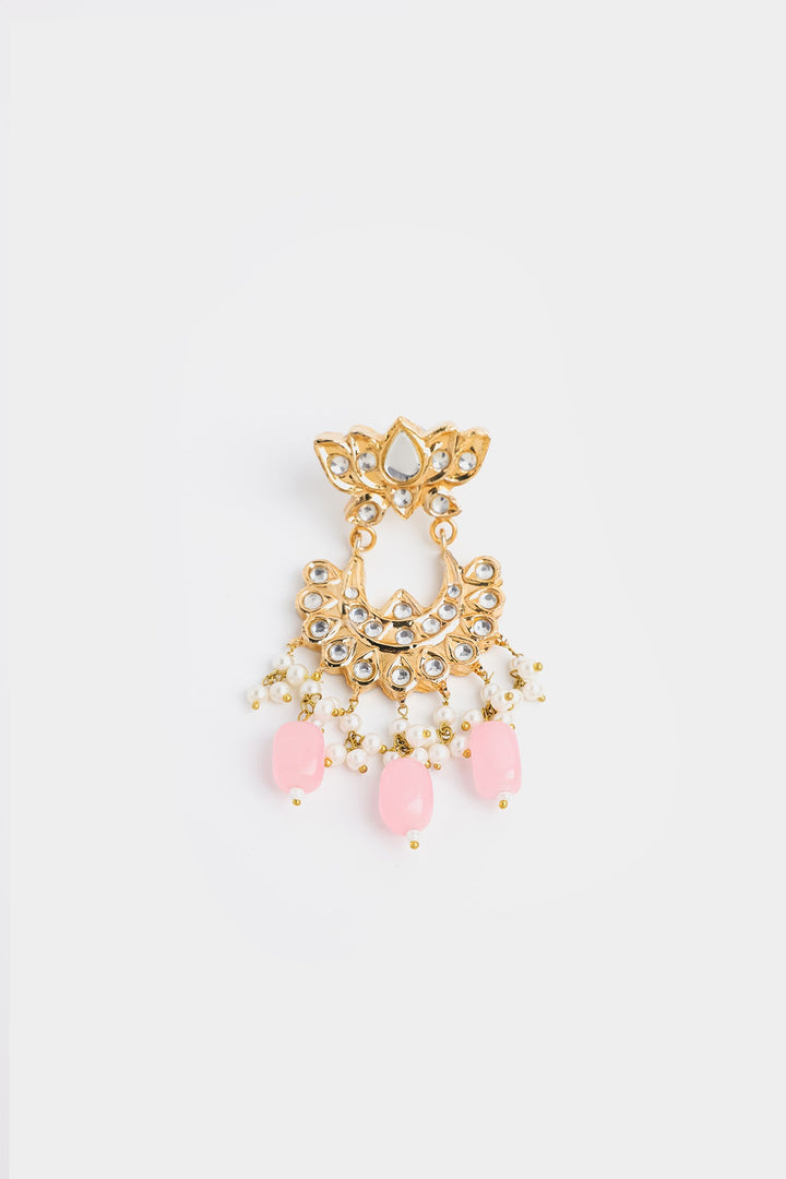 Dazzle with delicate charm in these enchanting drop earrings. Each piece showcases a beautiful golden lotus and crescent design, richly embellished with glistening kundan-stones and a graceful fringe of tiny pearls. A soft cascade of rose-pink beads adds a touch of romantic elegance, making them perfect for festive occasions or adding a sophisticated blush to your ensemble.