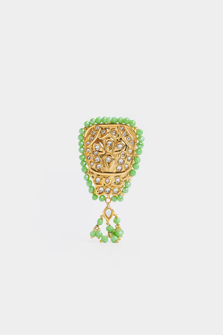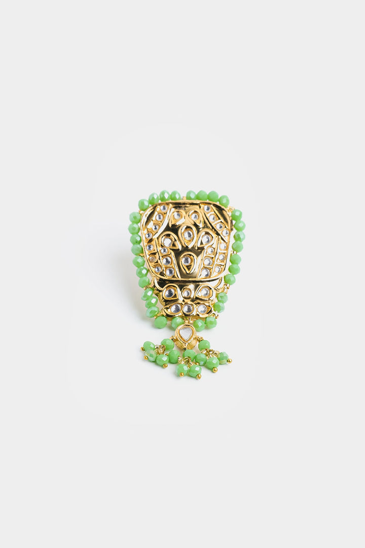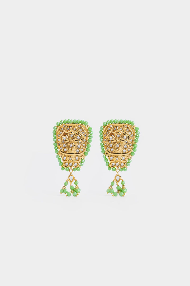 Embrace regal elegance with these exquisite, intricately designed earrings. Their unique silhouette, adorned with shimmering kundan-inspired work and framed by a vibrant border of delicate green beads, culminates in playful jhumka-style drops. Perfect for adding a touch of traditional splendor and a fresh pop of color to your festive attire or special occasions.