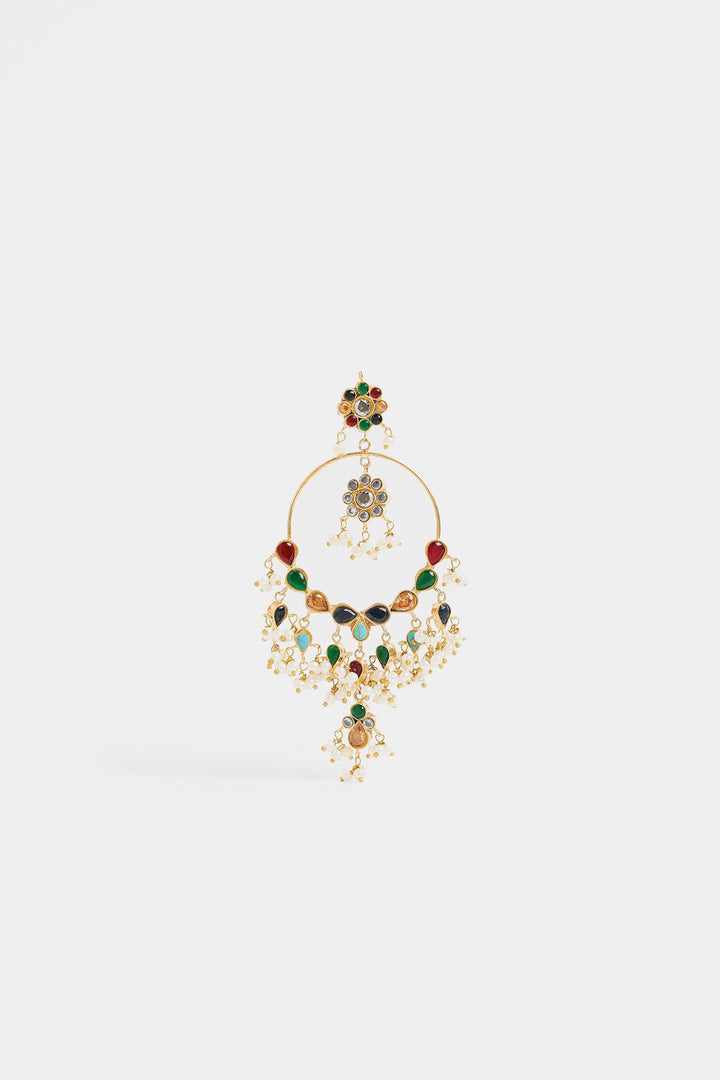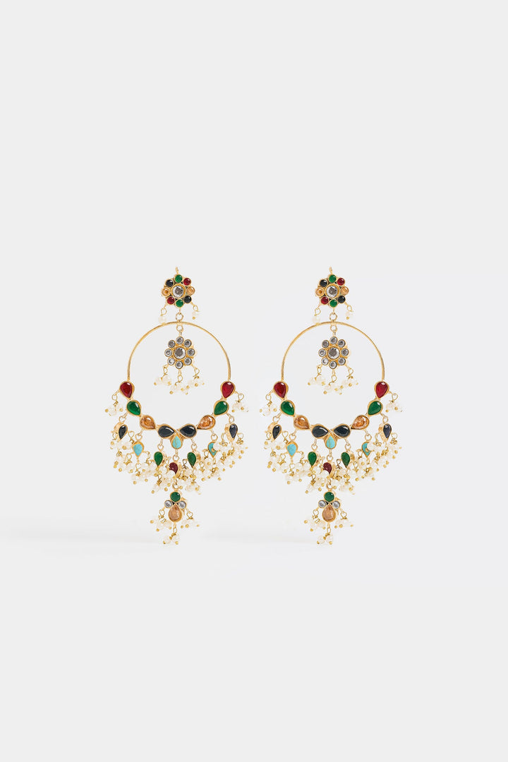 Embrace regal grandeur with these magnificent gold-toned hoop earrings. The intricate design begins with a delicate floral stud, followed by a smaller, detailed circular pearls that leads to the large, striking hoop. The main hoop is richly adorned with drops of colorful, faceted gemstones in deep reds, greens, blues, and amber. Cascading from the hoop are multiple delicate strings of tiny pearls and small, shimmering beads, creating enchanting movement and sparkle. These elaborate earrings are the perfect piece to complete any festive, high-fashion, or bridal occasion.