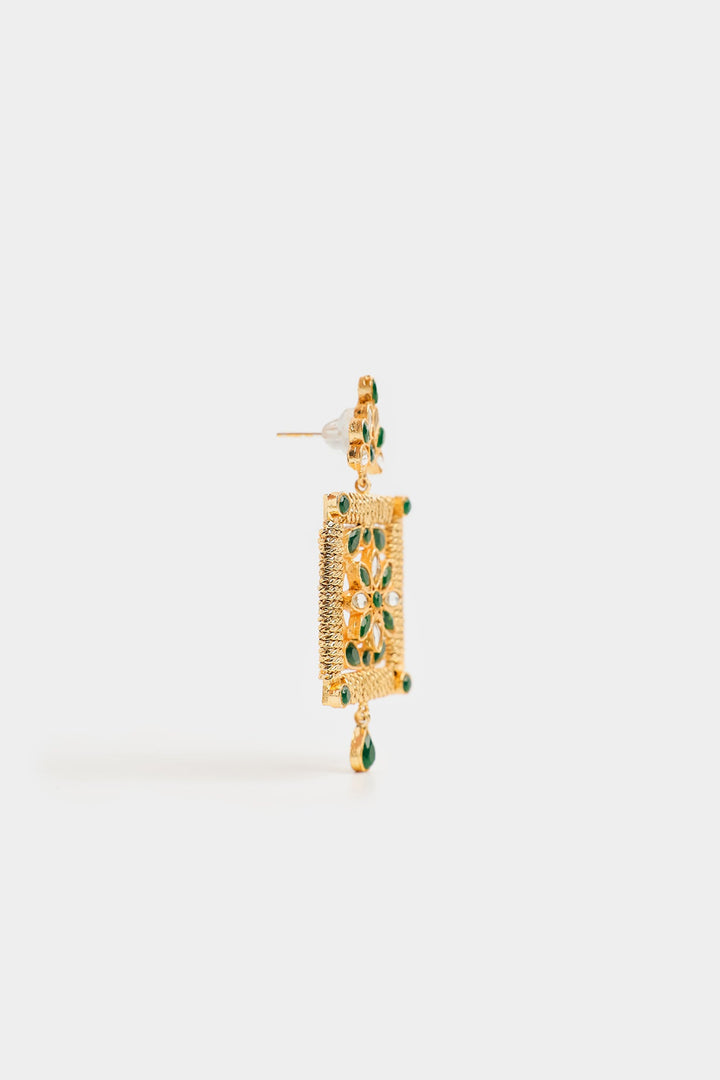 Make a statement with these intricately designed rectangular drop earrings. Featuring a delicate golden lattice adorned with sparkling clear and rich green stones, finished with a graceful green teardrop, they're perfect for adding a touch of regal elegance to your festive occasions.