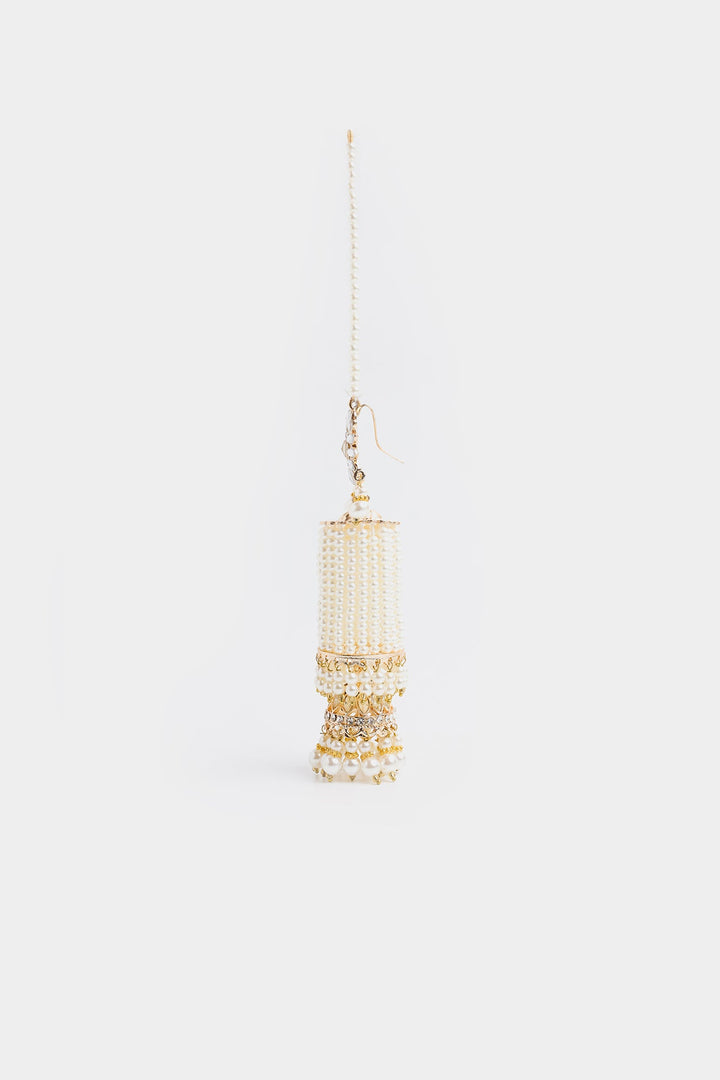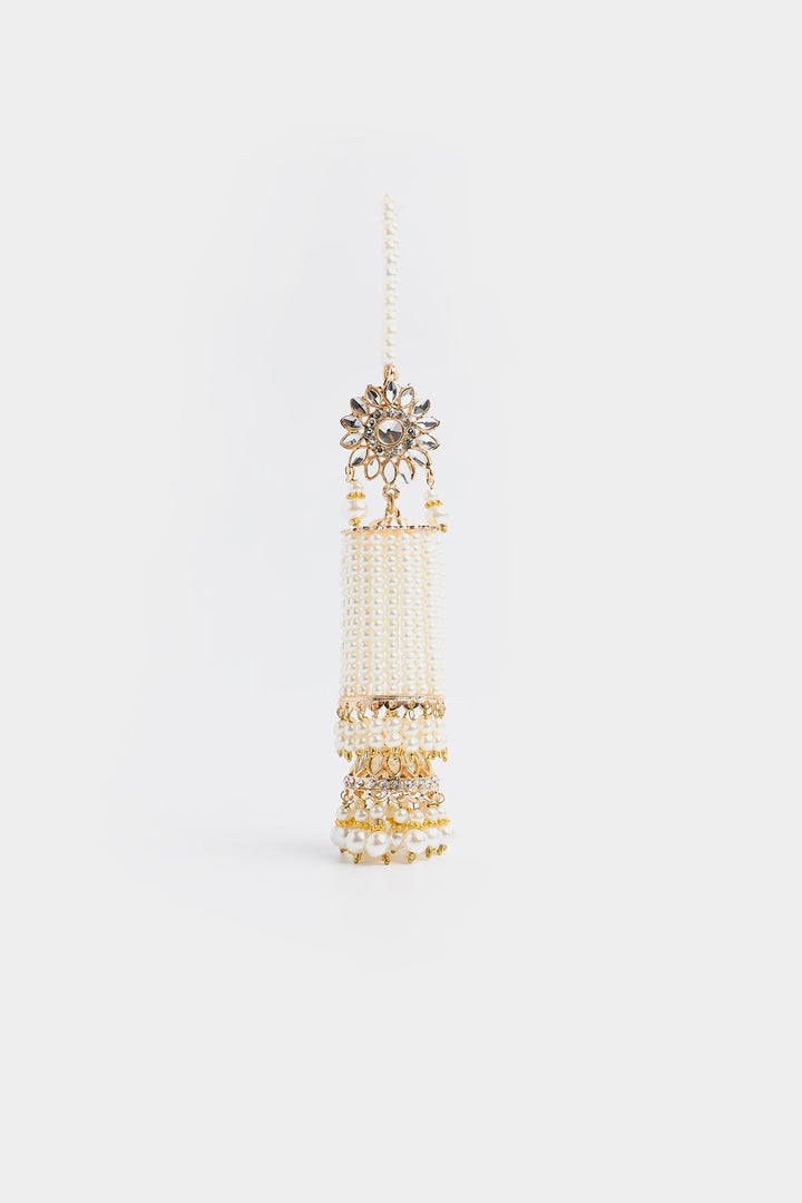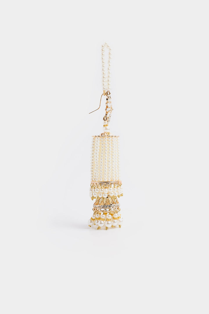 The earrings have a round, kundan flower stud at the top, Two interconnected hoops Small triangular or teardrop-shaped embellishments accentuate the design, and the earrings are adorned with dangling pearl-like beads, making. them ideal for weddings, cultural celebrations, or special occasions.