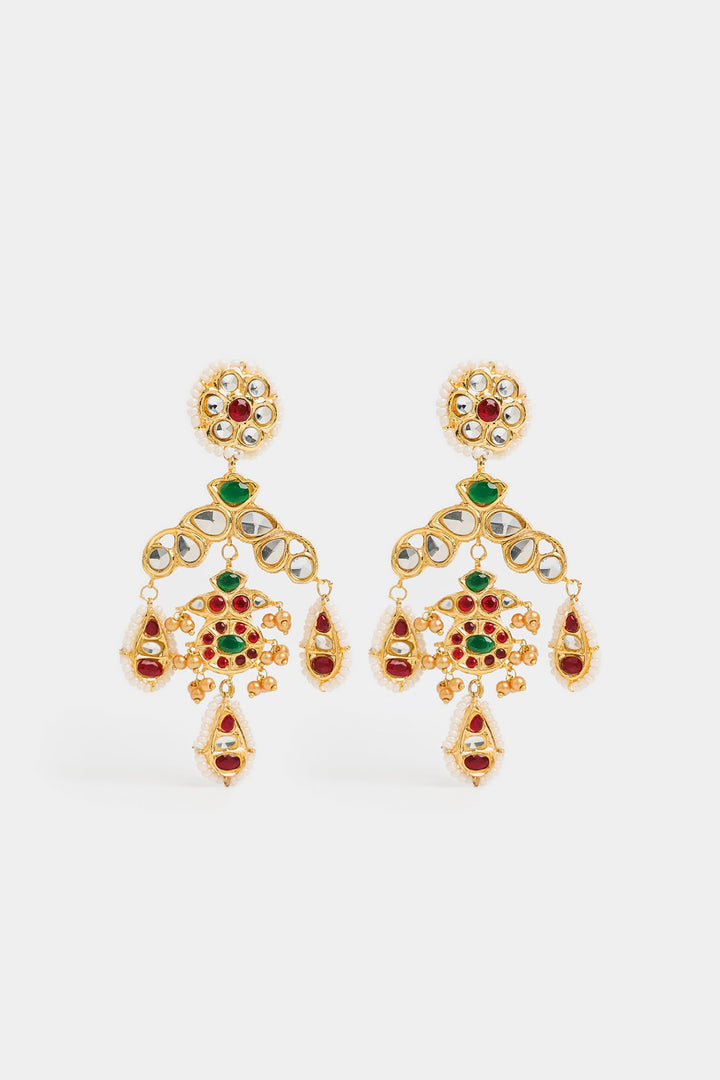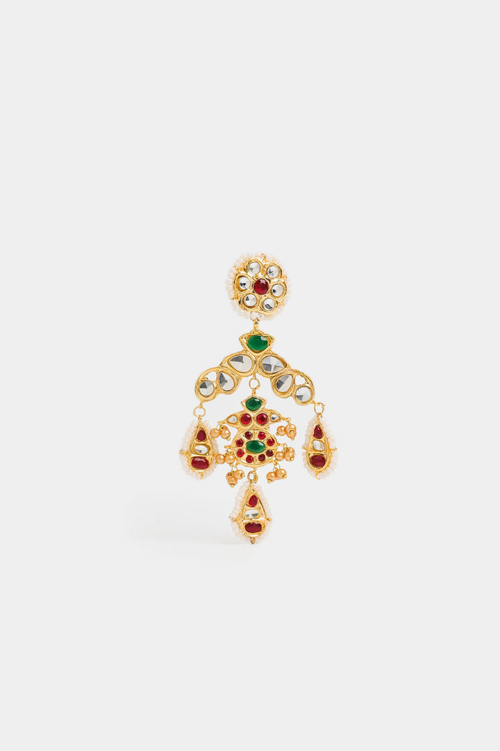 Unveil royal splendor with these majestic gold-toned mughal-inspired earrings. This elaborate hanging design features a detailed stud of a large pearl surrounded by seed pearls and tiny stones in red and clear white. Below this, a tiered chandelier silhouette is formed by intricate kundan-style frameworks adorned with sparkling clear, deep red, and emerald green stones. The bottom is finished with delicate dangling pearl teardrops and clusters of seed pearls, creating a magnificent piece that captures the essence of traditional craftsmanship and is perfect for a truly grand occasion.