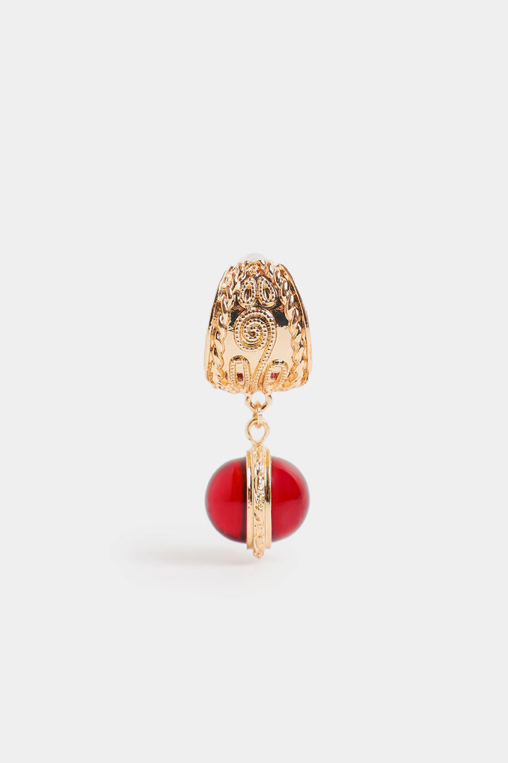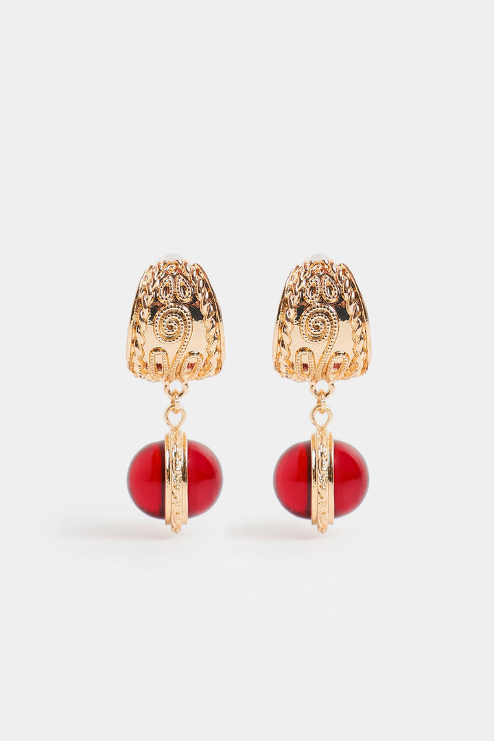 Elevate your style with these bold, gold-toned Orb Drop Earrings. The design features an ornate, traditional dome stud with intricate filigree detailing that sits on the earlobe. Dangling below is a large, smooth red glass orb held in place by a simple gold-toned frame. These earrings offer a striking contrast between the textured metallic upper piece and the vibrant, translucent stone, creating a memorable, contemporary-meets-classic statement accessory.
