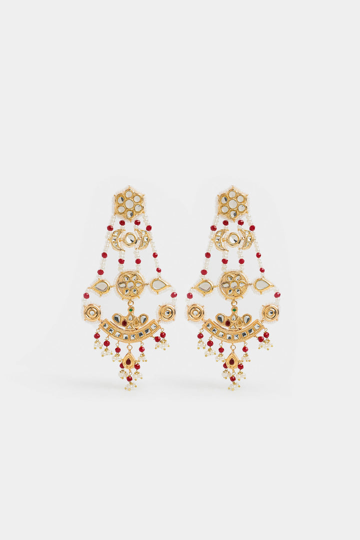Embrace the drama of traditional craftsmanship with these exquisite gold-toned chandelier earrings. This highly ornate, tiered design is rich with detail, featuring a symmetrical arrangement of Kundan-style work and glittering clear, red stones, all set in a bold golden frame. The elaborate structure is softened by delicate white seed pearls and tiny red beads, which cascade down in graceful strings. These magnificent earrings are a true statement piece, perfect for bringing luxurious texture and royal flair to any formal or wedding attire.