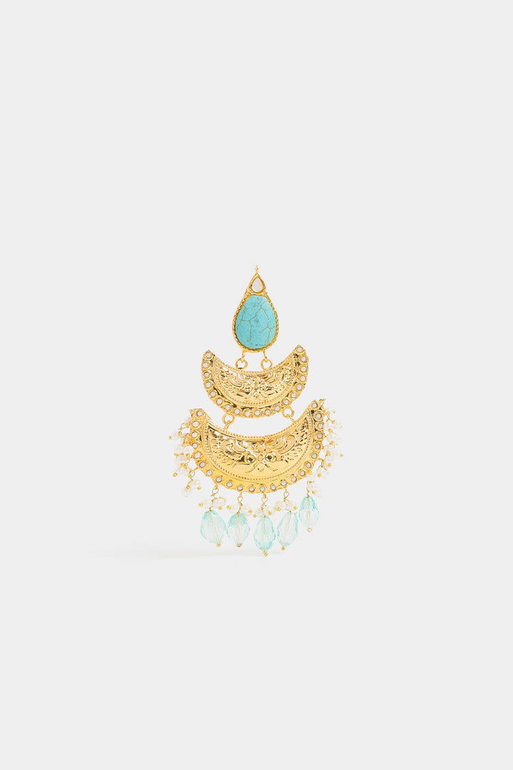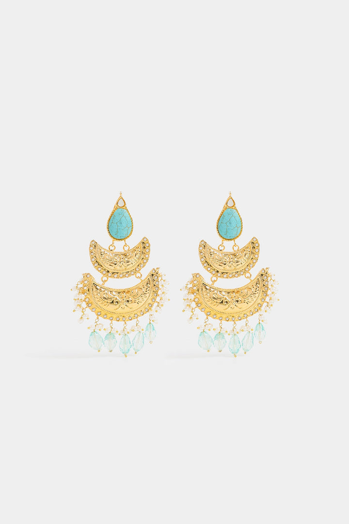 Embrace bohemian luxury with these stunning gold-toned tiered earrings. The elaborate design begins with a striking teardrop-shaped turquoise stone at the stud. Below this, three crescent-shaped tiers cascade downwards, each adorned with rich filigree work and a hammered texture. The entire piece is beautifully finished with delicate drops of tiny white pearls and shimmering, pale blue crystalline beads, creating a dramatic, globally-inspired accessory perfect for adding a touch of exotic elegance to any look.