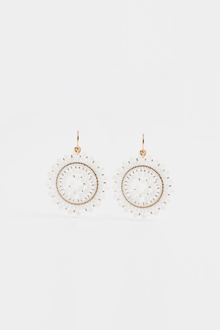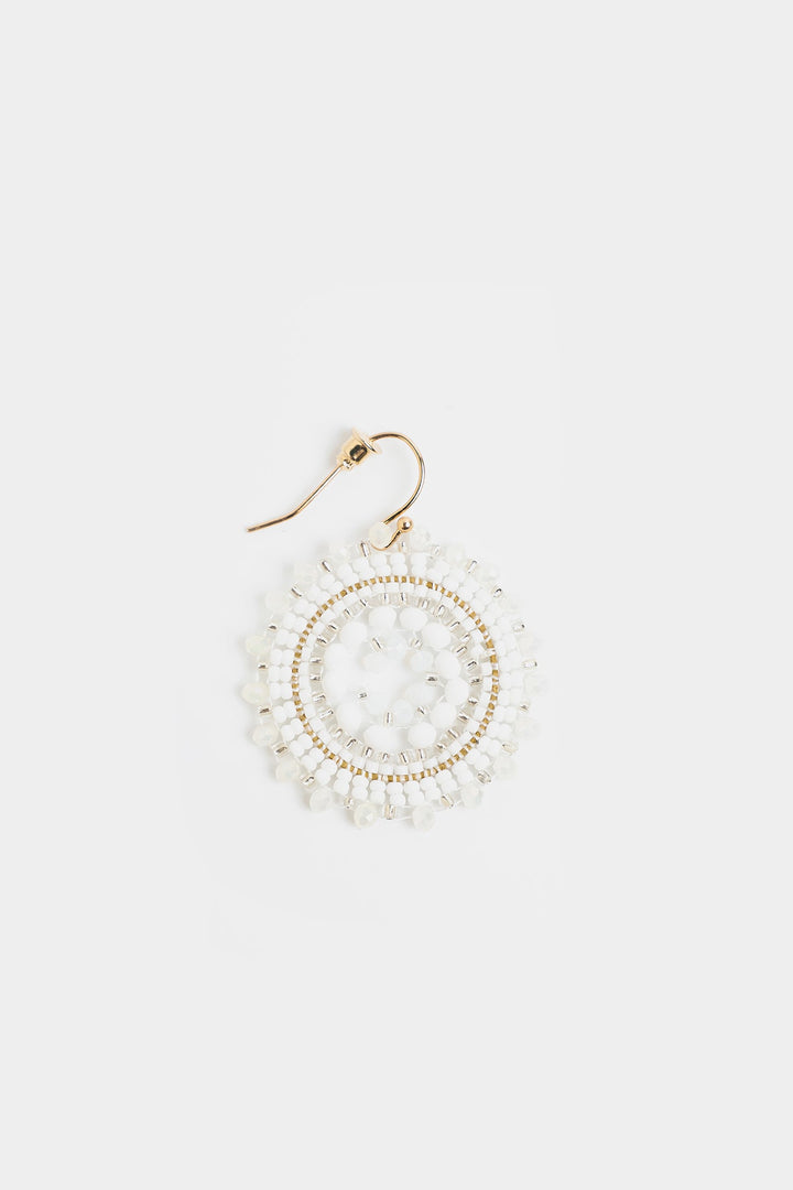 Channel bohemian elegance with these exquisite circular dangle earrings, intricately crafted with delicate white beads forming a captivating, ethereal design. Perfect for adding a touch of sophisticated charm.