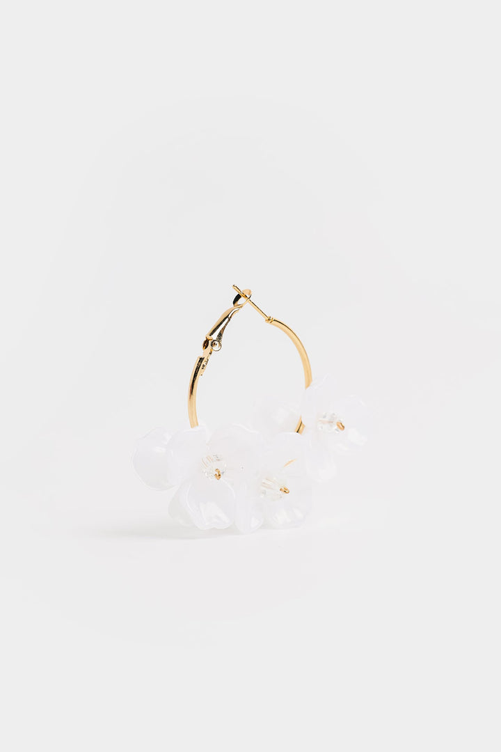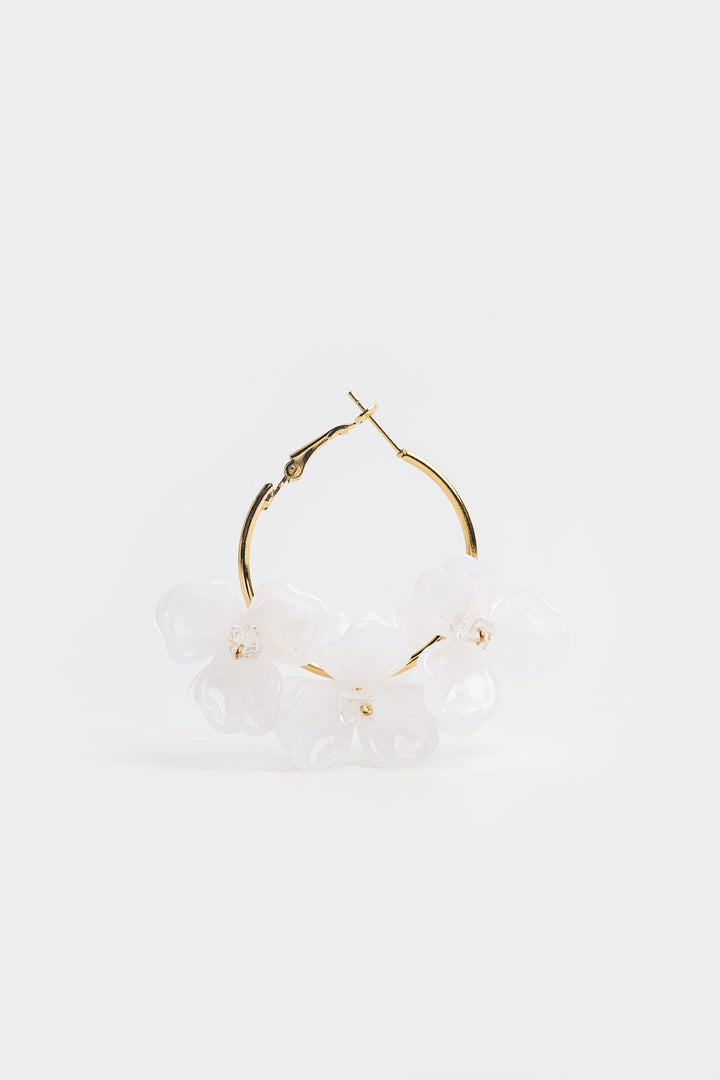 These earrings are delicate floral hoop earrings with a soft, feminine aesthetic. Adorned with translucent white flower embellishments, giving a fresh and graceful look. Lightweight and airy design, perfect for casual wear or daytime events.