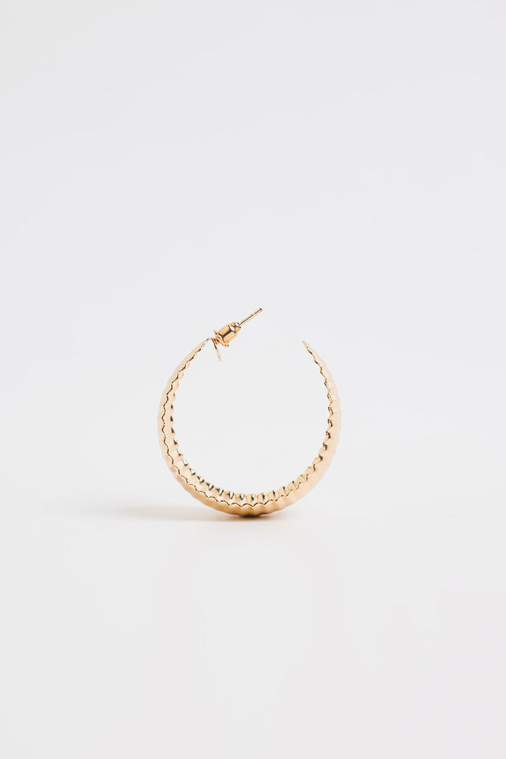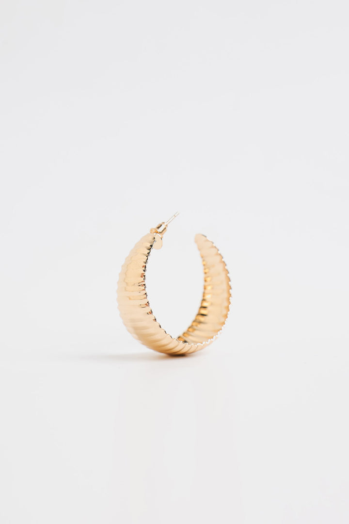 Elevate your everyday with these uniquely textured gold-toned hoop earrings. Their subtle, ribbed design catches the light beautifully, offering a sophisticated and modern twist on a timeless classic, perfect for any occasion in Lahore.