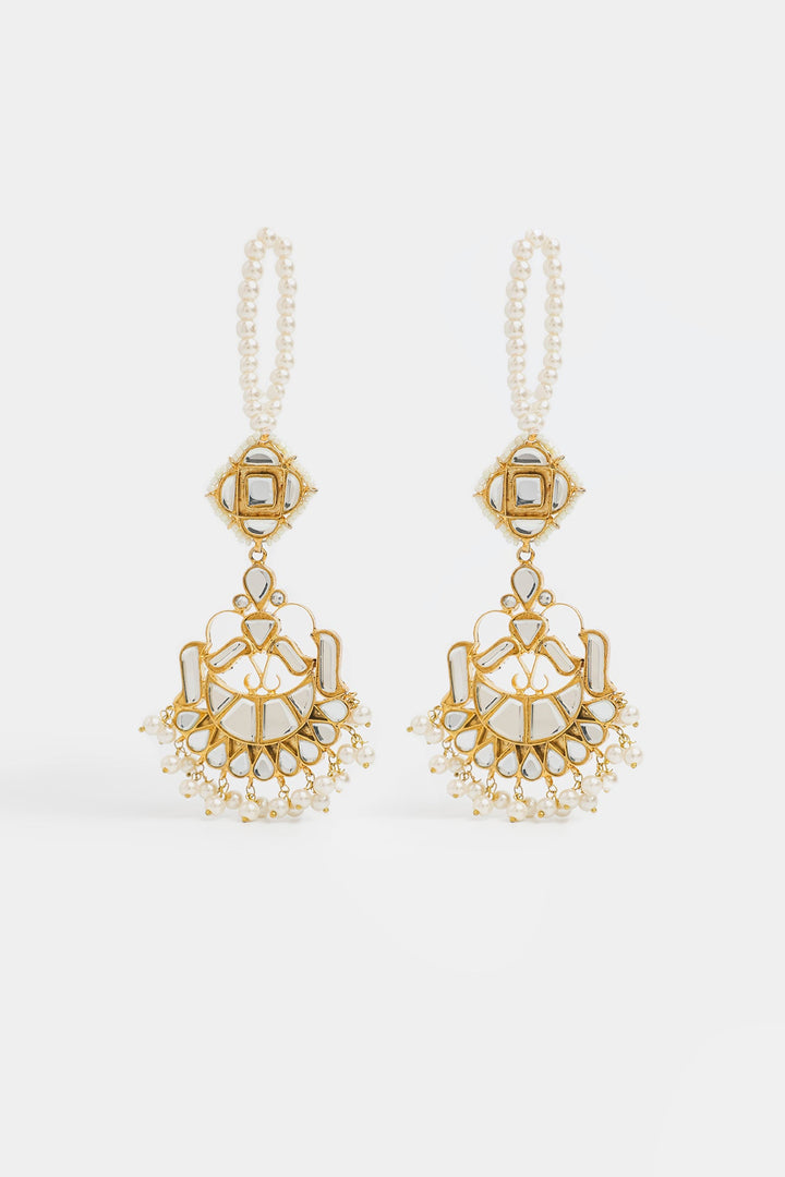 Channel royal splendor with these exquisite gold-toned mughal-inspired earrings. The design features a stud of a classic quatrefoil shape, intricately detailed with Kundan-style mirror work and framed in gold. From this, a magnificent, stylized pendant drops, also richly set with mirror work and fine gold metal detailing. Delicate fringes of white seed pearls cascade from the bottom of the pendant, creating shimmering movement. The piece is completed by an elegant, curved string of uniform pearls that extends upward, designed to be worn secured near the hairline, lending a touch of timeless, ceremonial glamour. -Gold Color