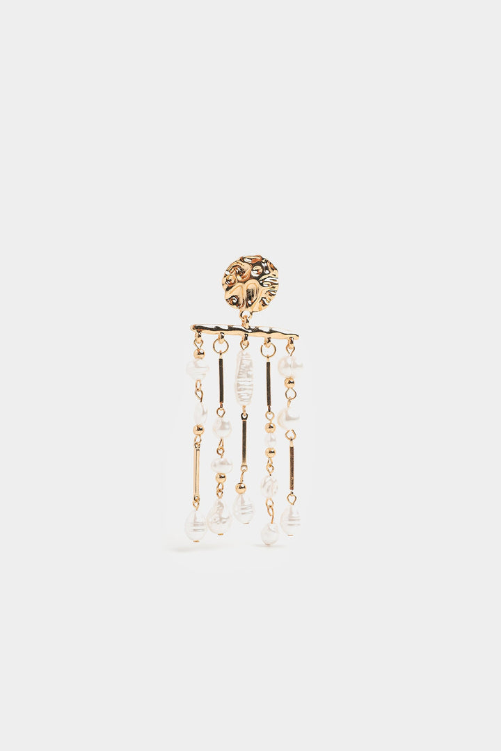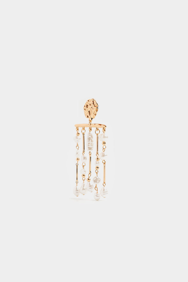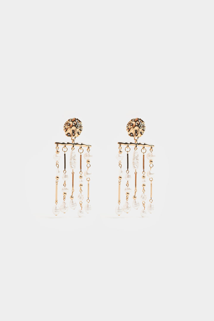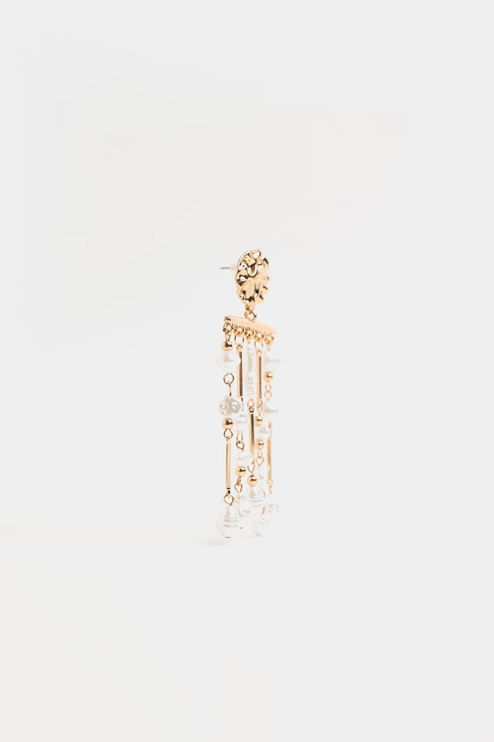 these stunning chandelier earrings are designed to make a statement. The earrings feature a textured, antique gold-toned stud with a decorative, embossed pattern. Hanging from this stud is a series of delicate, dangling chains adorned with a mix of small gold-toned beads, thin gold-toned rods, and lustrous, irregularly shaped faux pearls. The tiered design creates a beautiful sense of movement and sparkle, making them a sophisticated choice for any occasion.