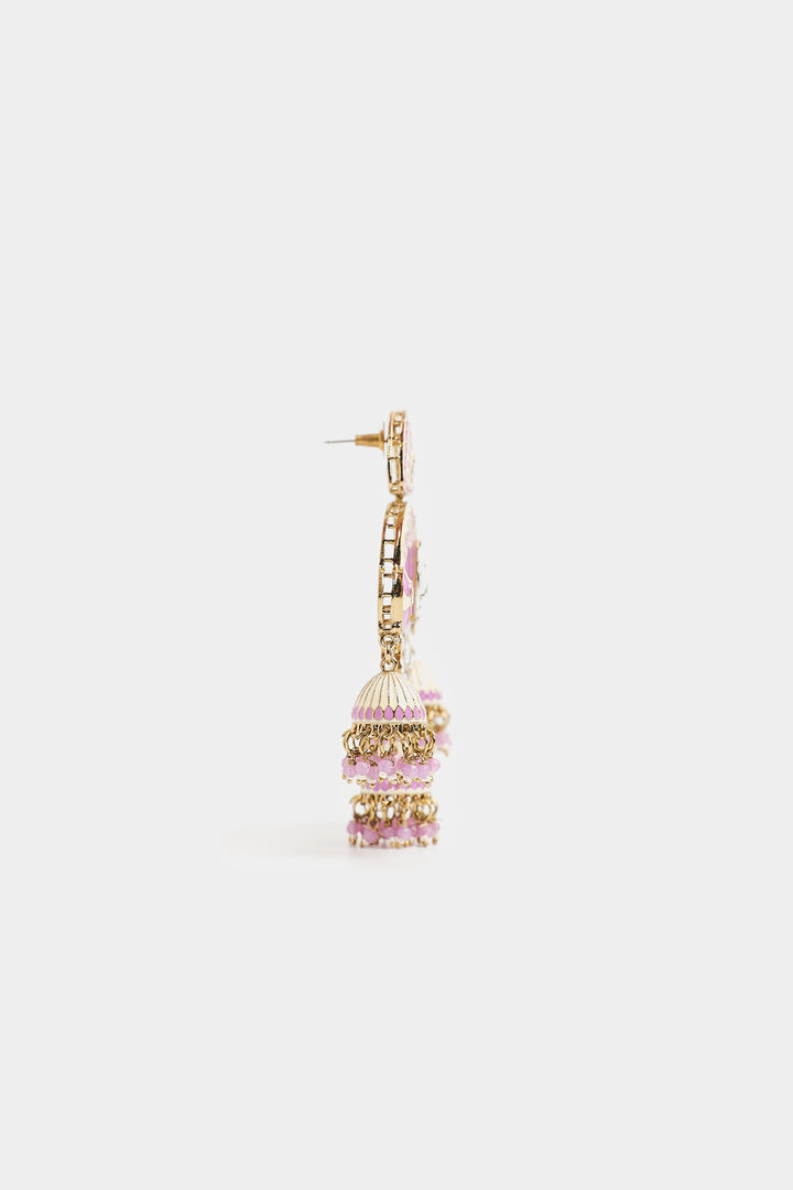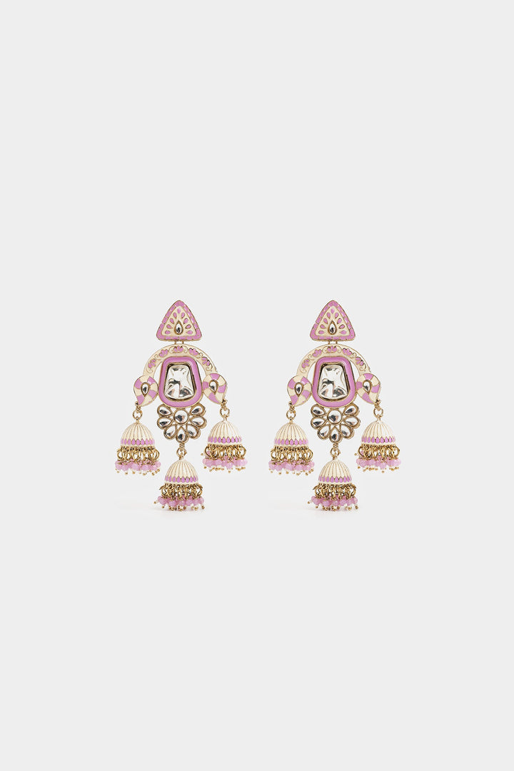 These earrings feature a small rectangular stud at the top, elegantly complemented by three dangling jhumkas that add traditional charm and rhythmic movement. A sophisticated piece suitable for both festive occasions and everyday wear.