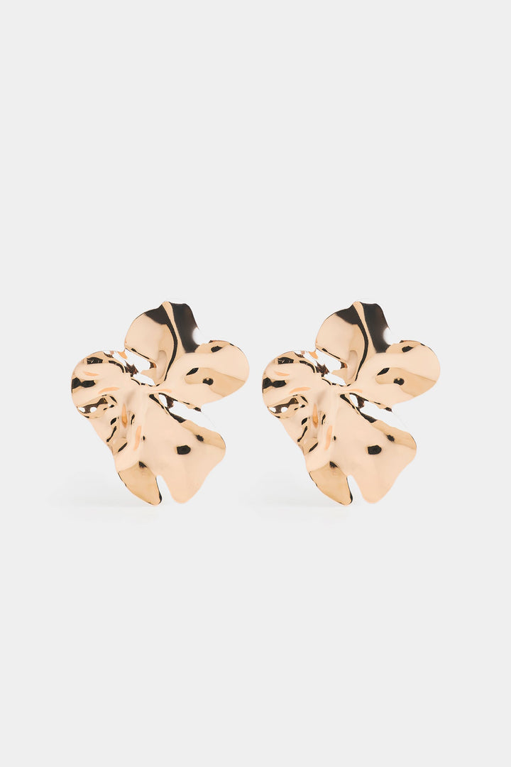 This gold flower earring highlighted with curved, open-hoop shape and textured metallic finish. it catches light and its sculptural, statement-making design. It is modern statement for any look.