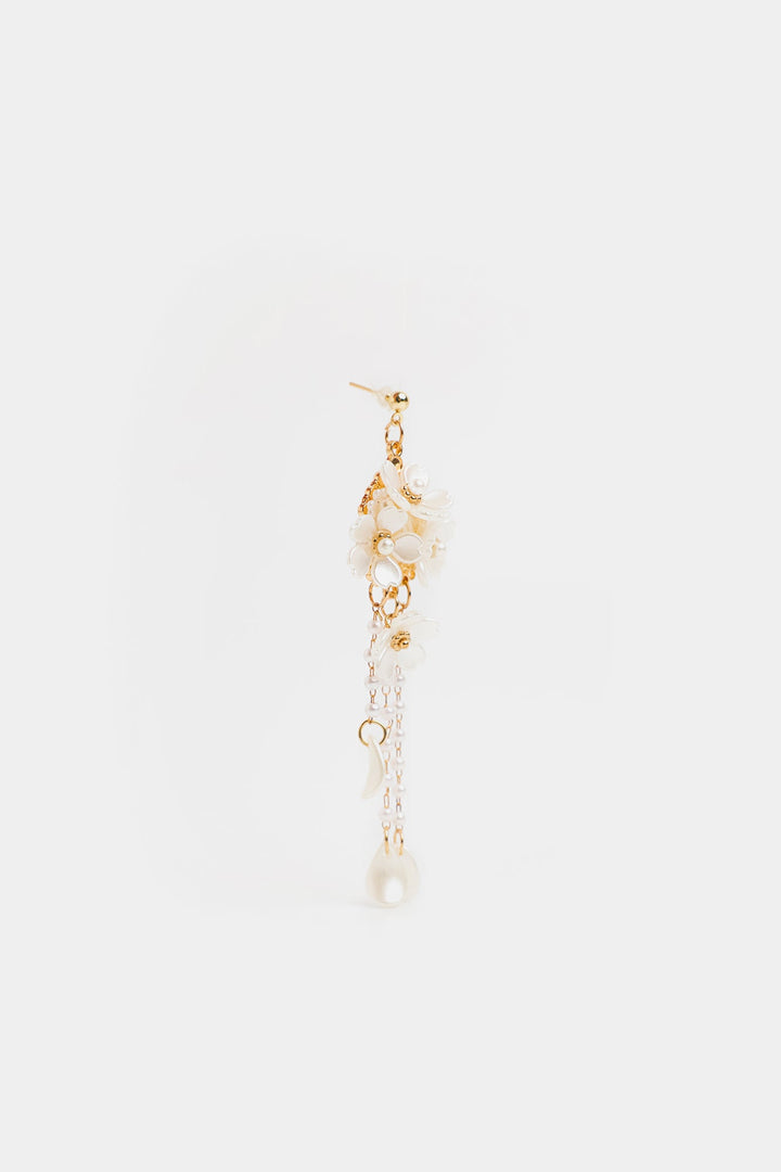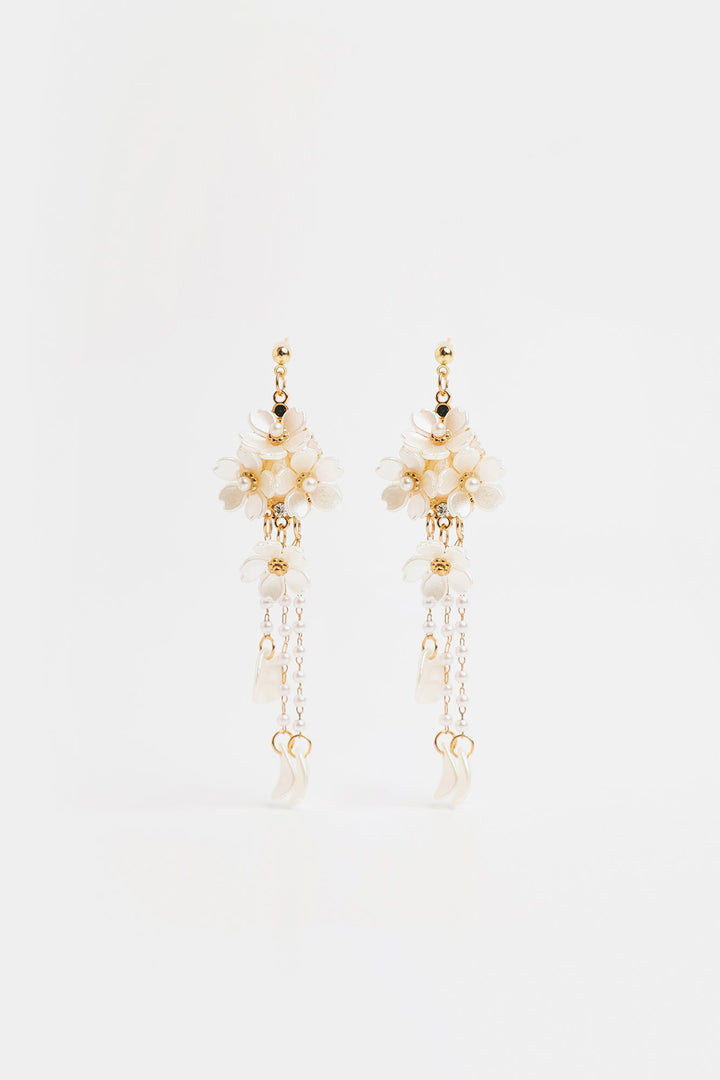 These earrings feature delicate small flower motifs complemented by hanging leaf-like elements. The expert design blends nature-inspired details with graceful movement, creating an elegant accessory that enhances any refined look.
