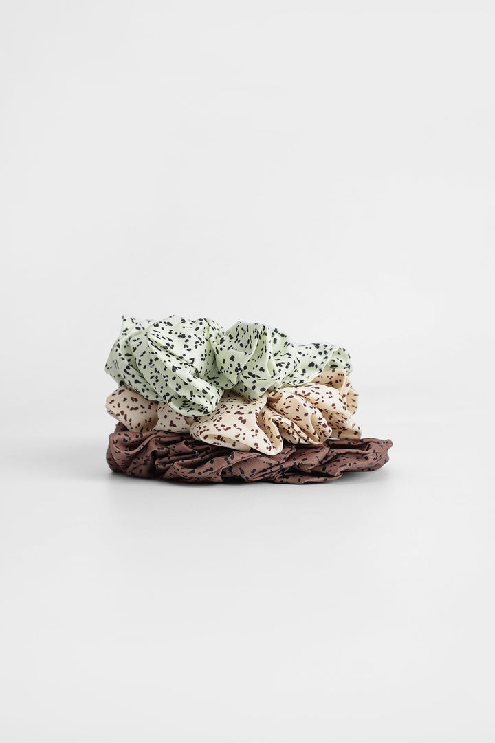 A mesmerizing design is portrayed on these trendy scrunchies rendered in white, beige and plum shade. Adorned with artistic illustration printed on them, These contemporary scrunchies are a perfect option to get your hair sorted with ease.