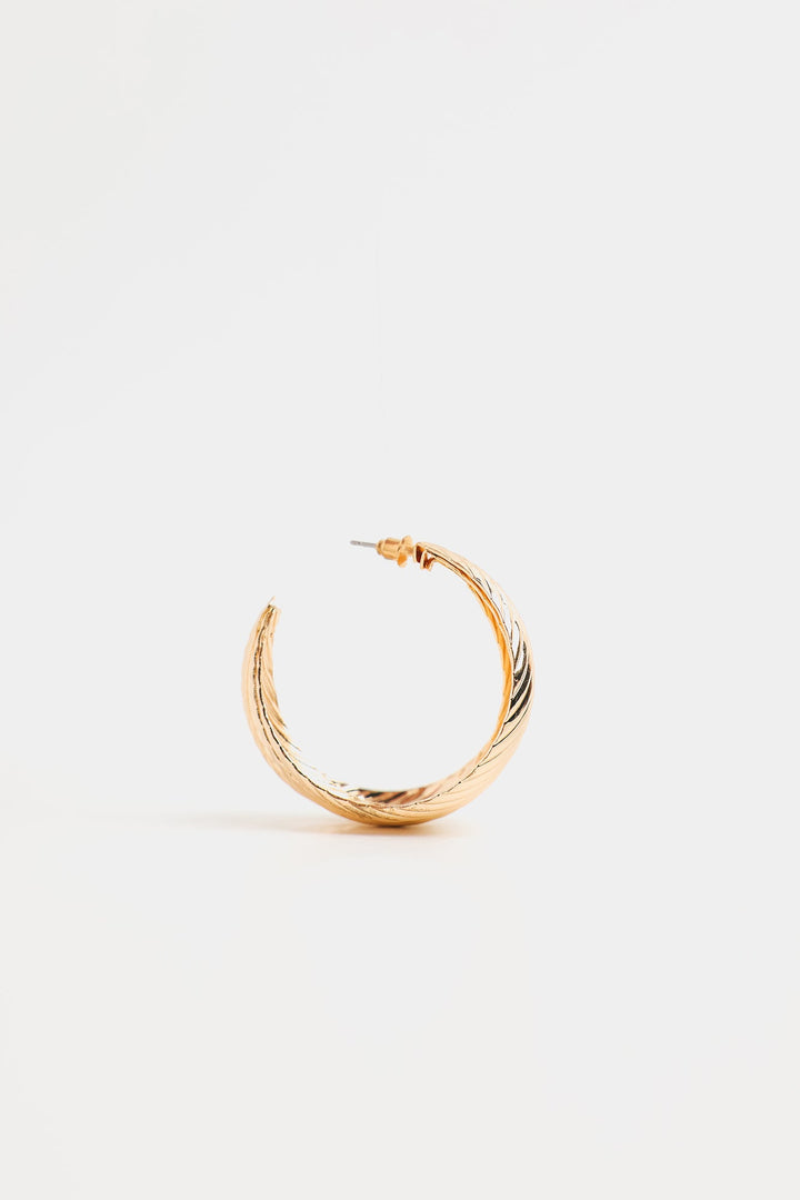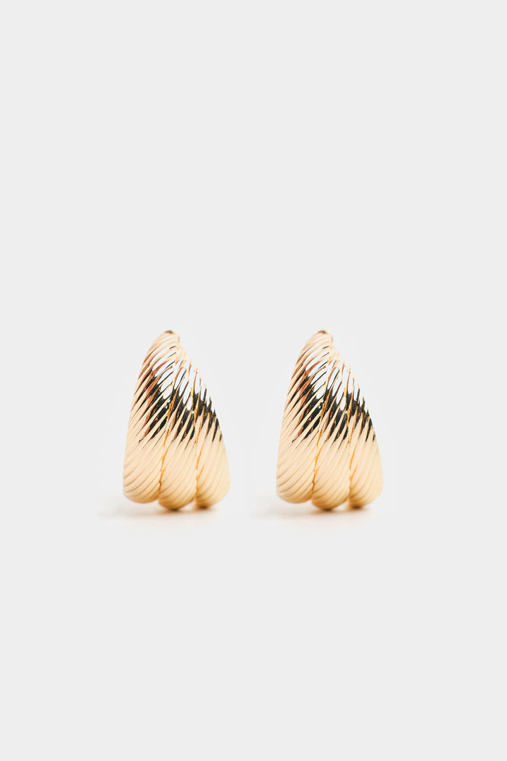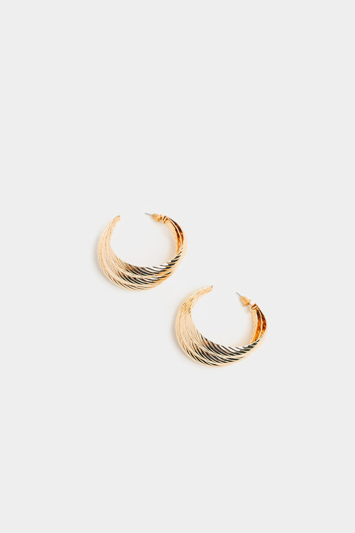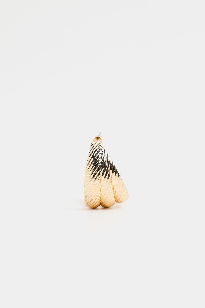 This textured gold hoop earring with a wide, curved design and a ridged surface that reflects light for a shimmering effect. It has a modern yet elegant look, making it versatile for both casual and formal outfits.