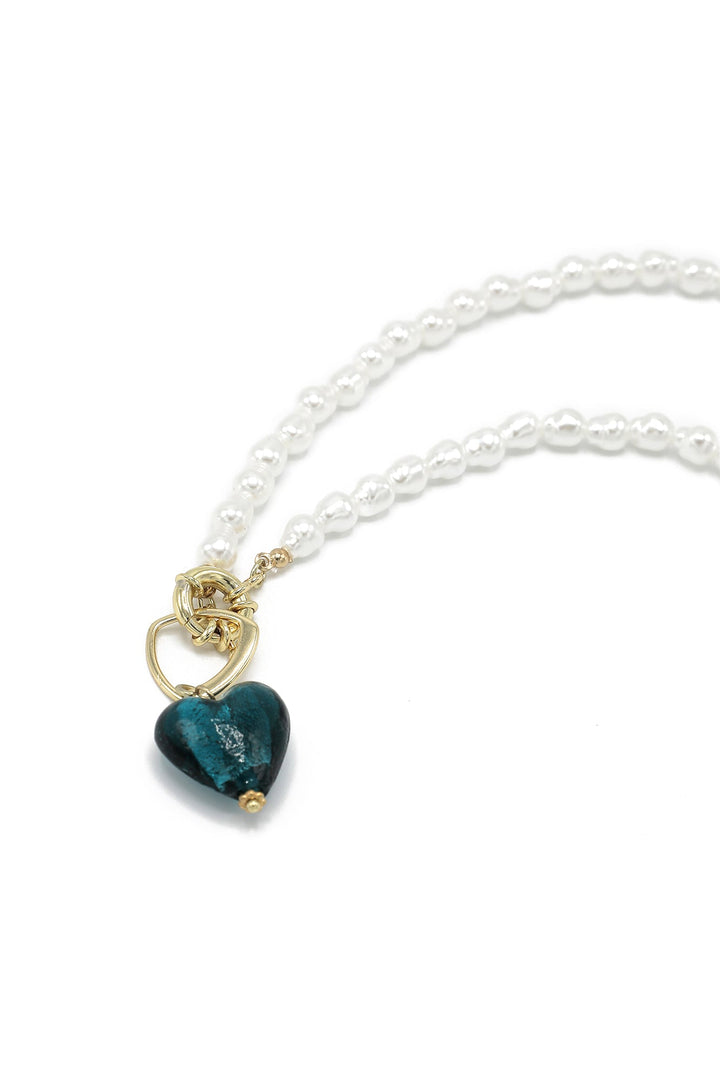 A mesmerizing composition is portrayed on this graceful necklace adorned with pearls in white shade. Enhanced with heart silhouette pendants in contrasted deep blue hues, this classy necklace is a pure example of timeless elegance to embrace with sophisticated outfits.