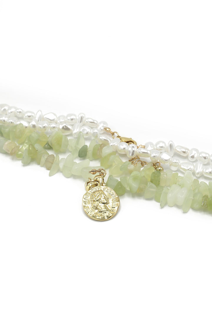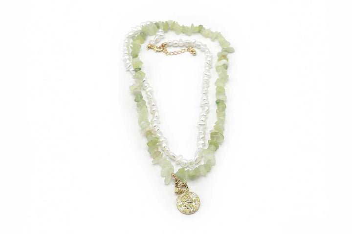 Be the epitome of grace this happening season with this elegant necklace made from dull green stones and beads in silver accents. Adorned with a dazzling coin pendant, this exquisite necklace is a great option to style with sophisticated outfits this season.