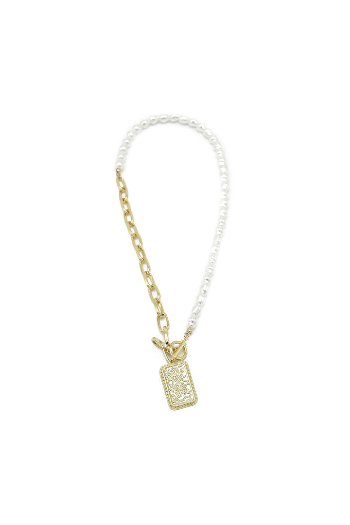 A contemporary design is portrayed on this elegant necklace comprised of chain and beads in celestial white and gold accents. Complimented with a trendy pendant, this exquisite necklace is great option to style with sophisticated outfits.