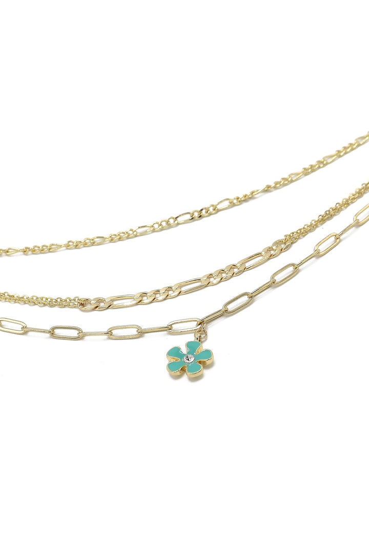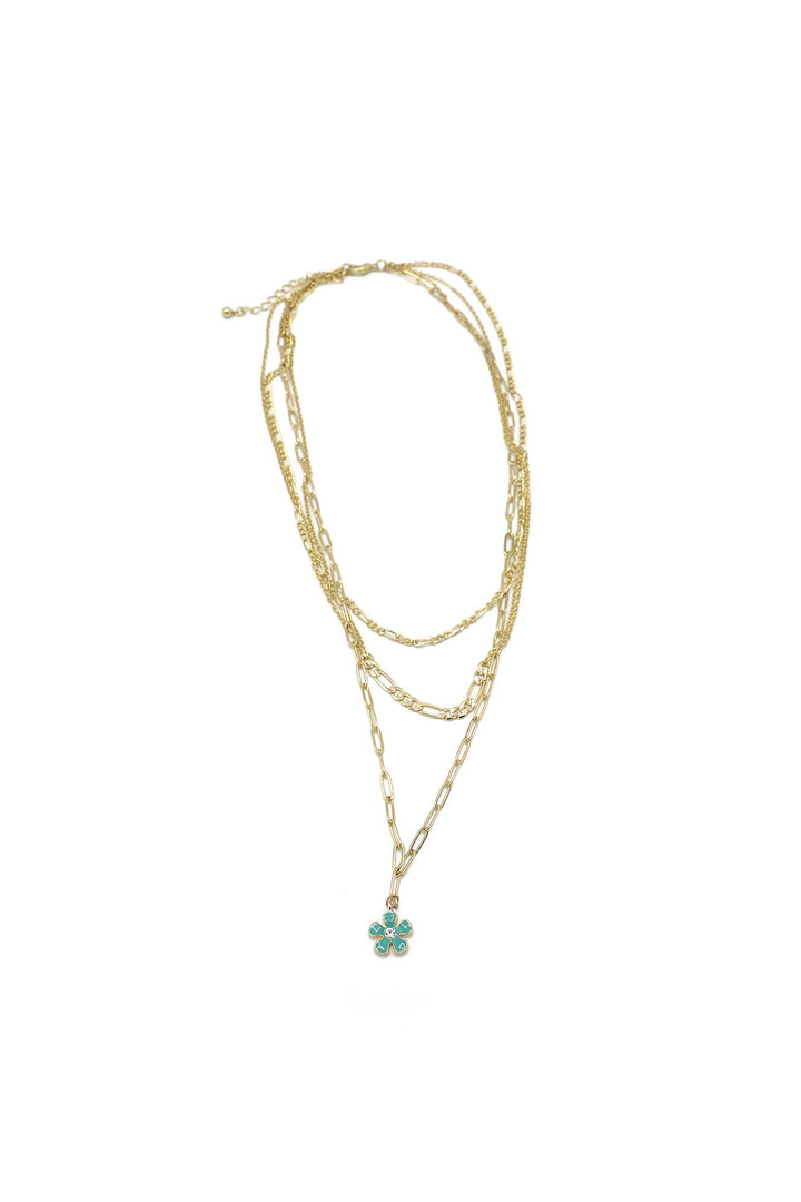 A fascinating design is portrayed on this elegant necklace depicting chain strings in gold hues and complimented with a flower pendant rendered in contrasted turquoise hues. Style this contemporary necklace with variety of outfits this season.