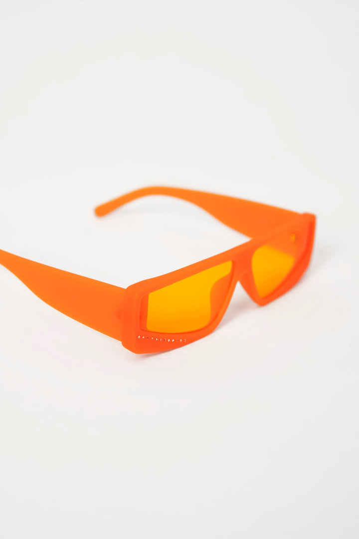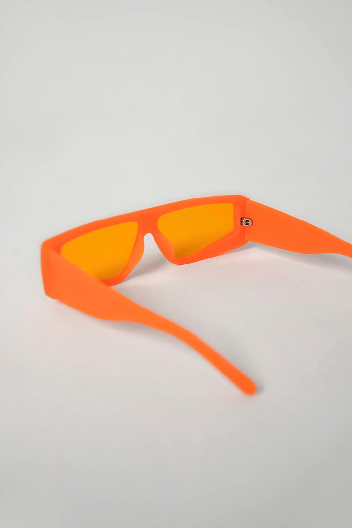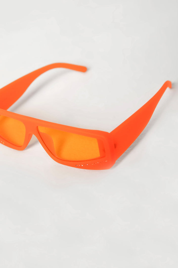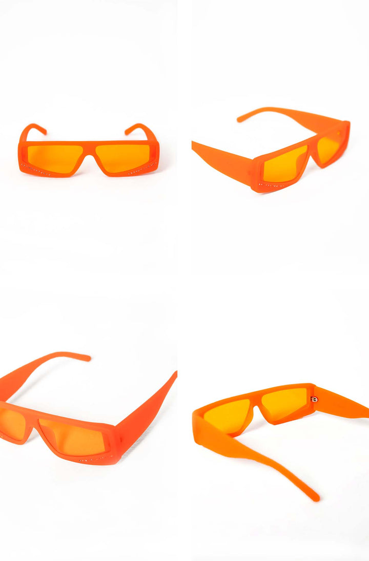 Perfect to embrace the streetwear style, these bold, thought-provoking sunglasses are displayed in bright orange shade. Designed with a rectangle frame, these gleaming orange tinted sunglasses are finished with studded beads at front bottom and depicts a recognizable look.