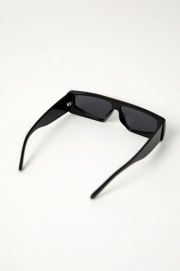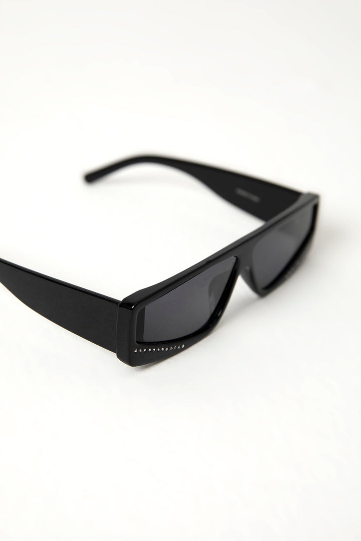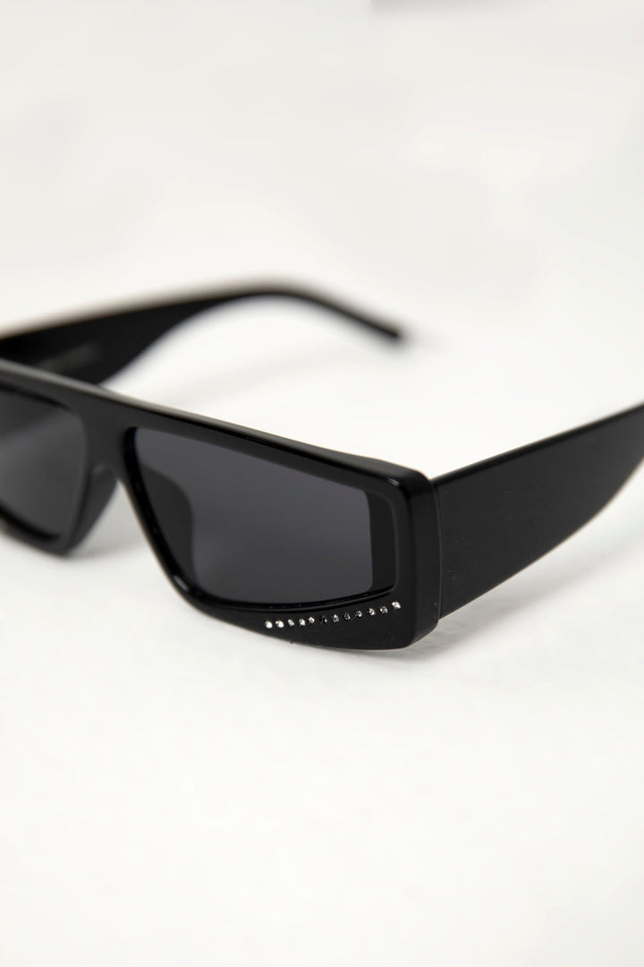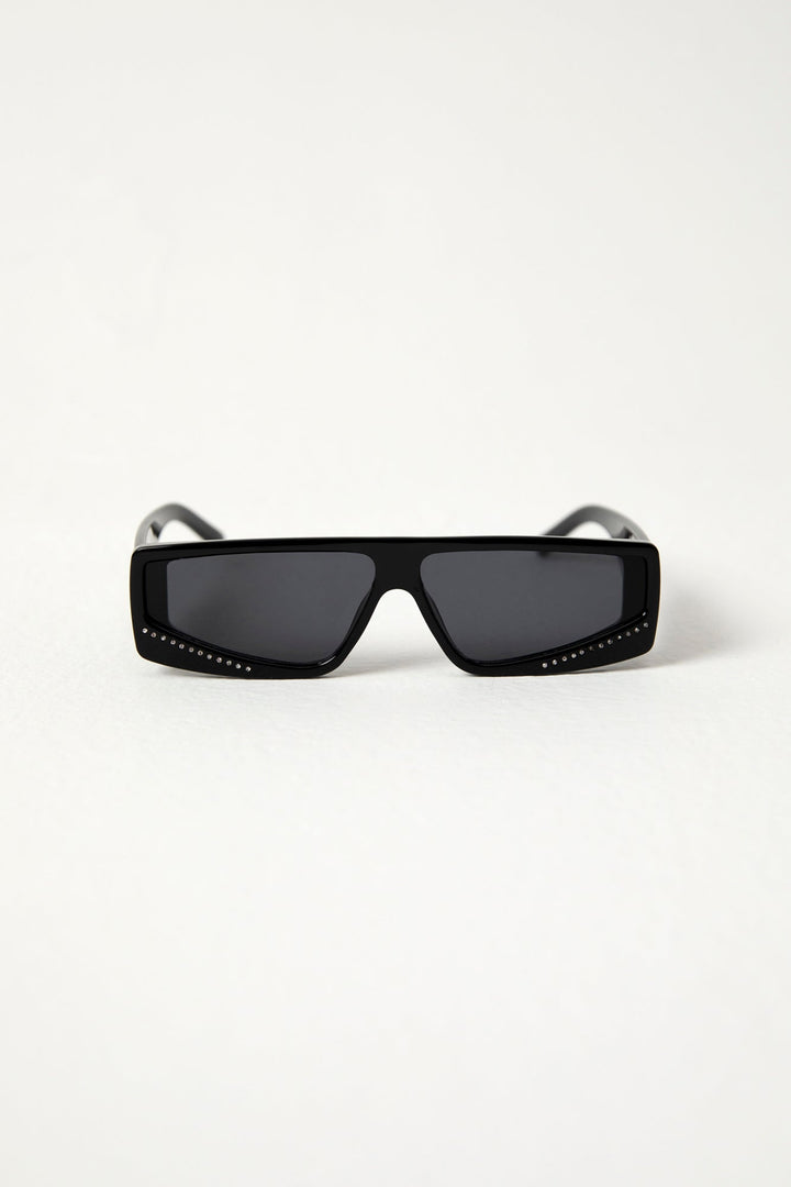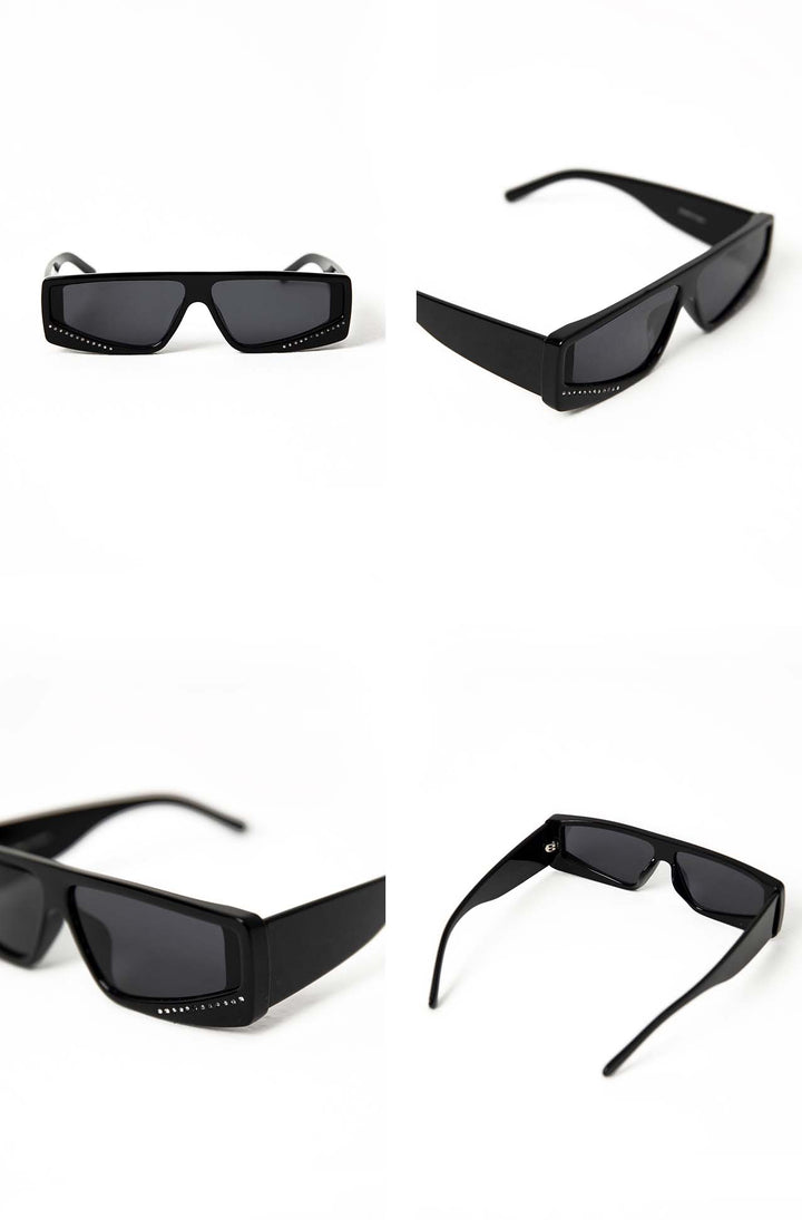 Perfect to embrace the streetwear style, these bold, thought-provoking sunglasses are displayed in classic black shade. Designed with a rectangle frame, these black tinted sunglasses are finished with studded beads at front bottom and depicts a recognizable look.