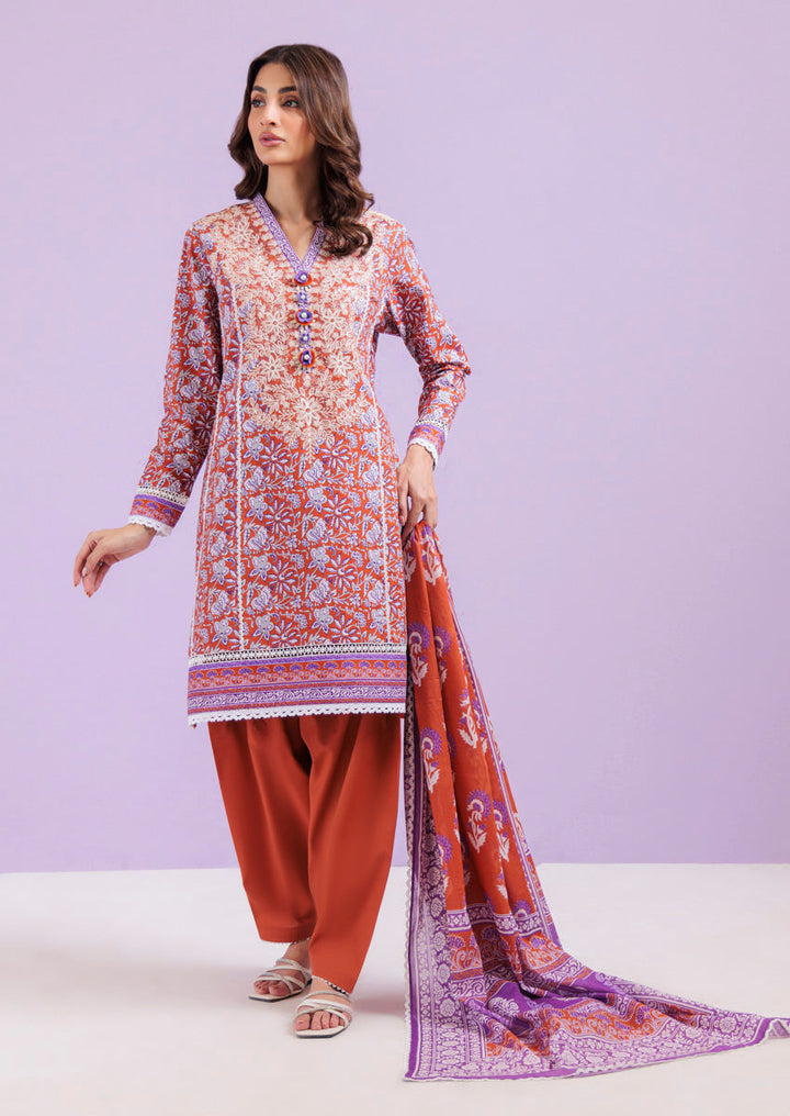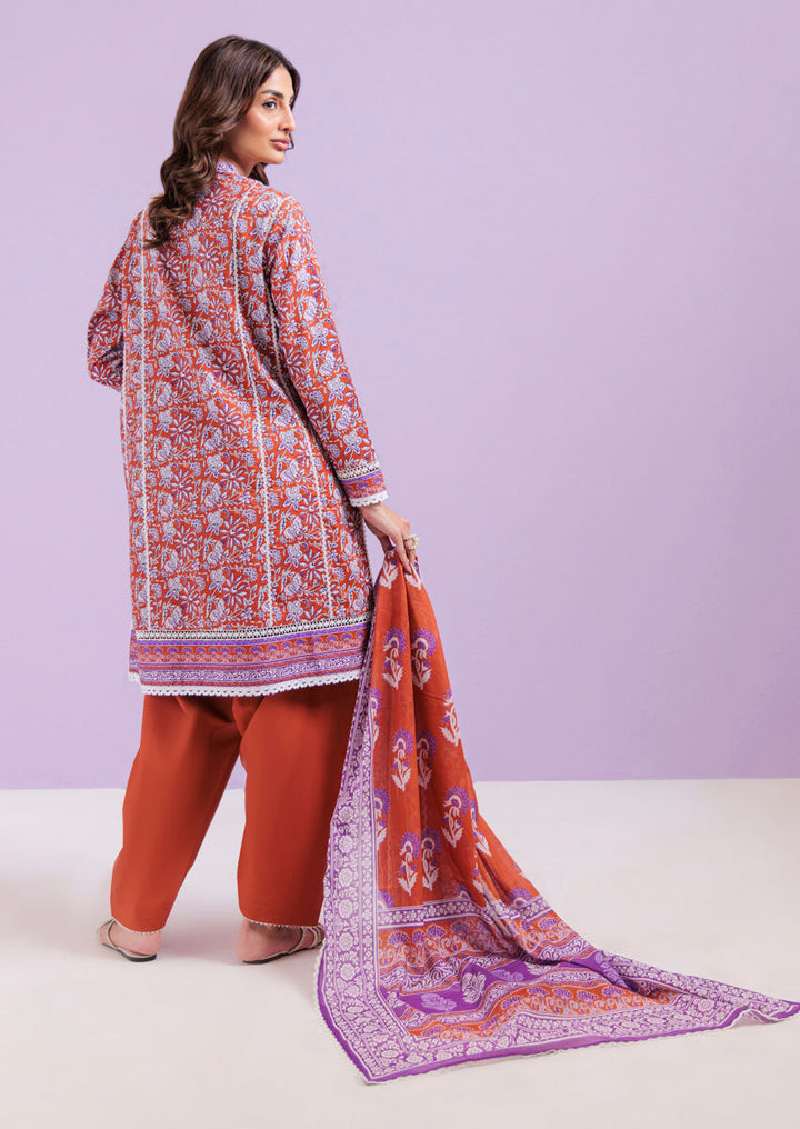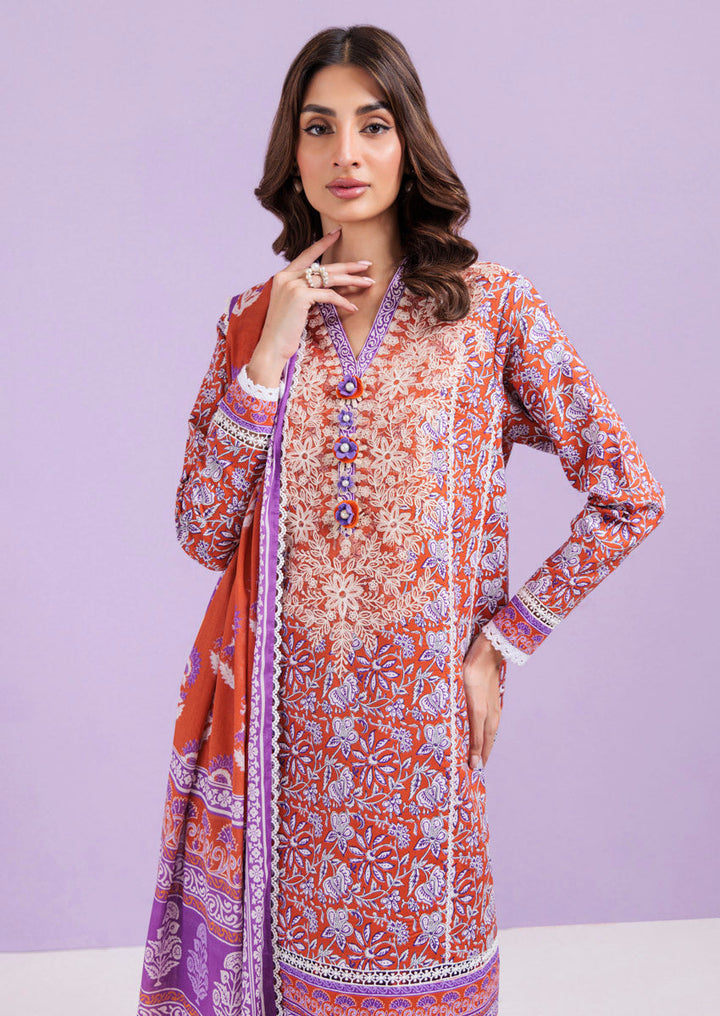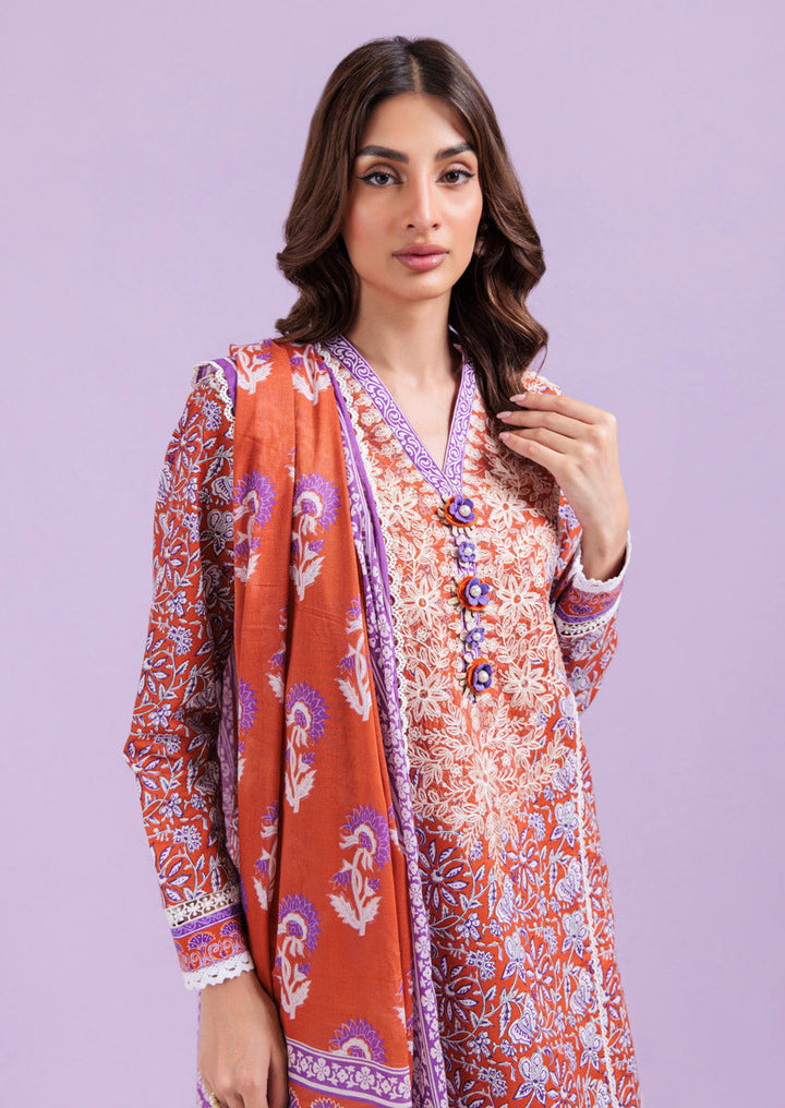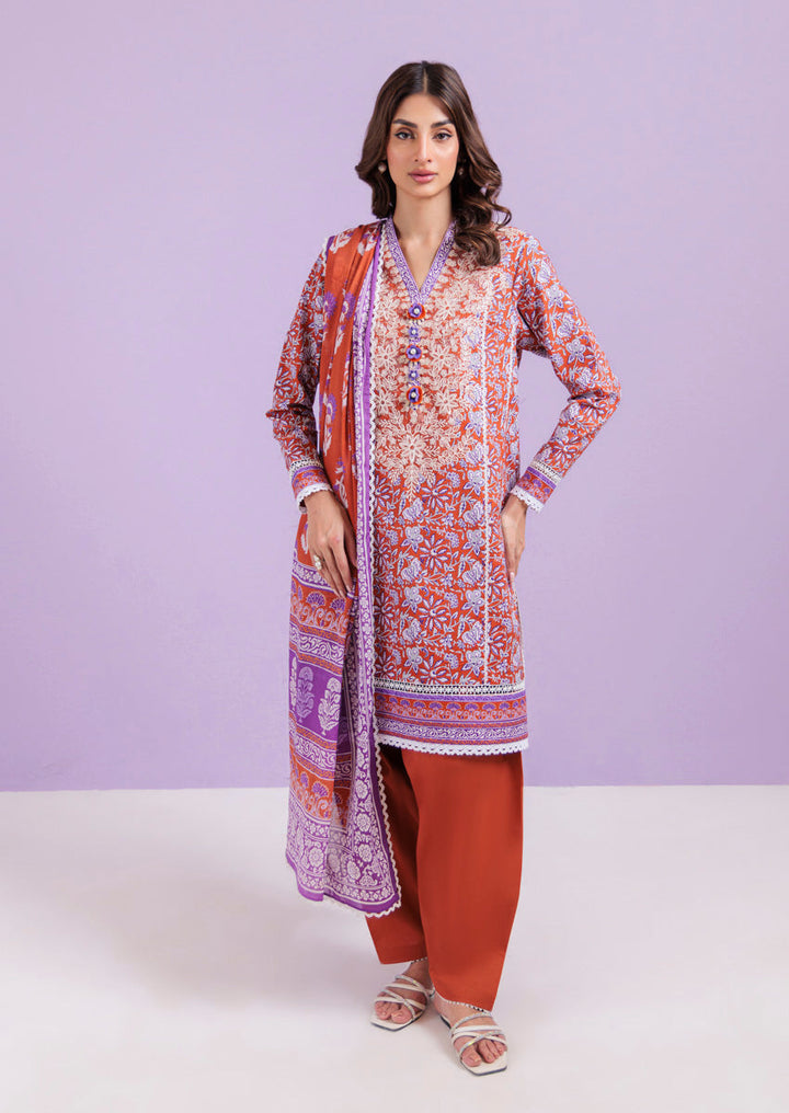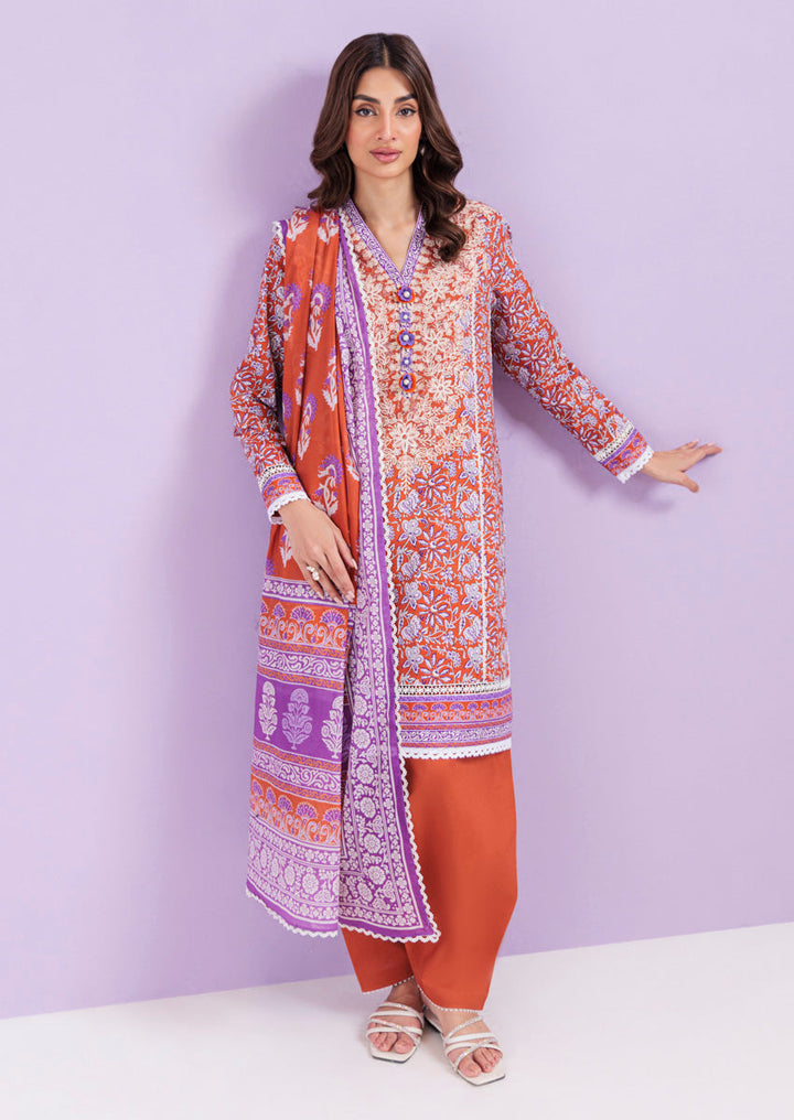 This unstitched ensemble brings block print artistry to life with intricate patterns and heritage-inspired motifs. Rendered in a vibrant burnt orange base and accented with lilac and ivory detailing, the design evokes a timeless traditional charm. The printed dupatta in coordinating hues adds a refined finish—perfect for elevating your festive or everyday wardrobe.