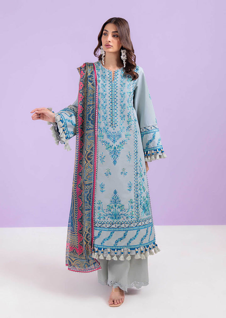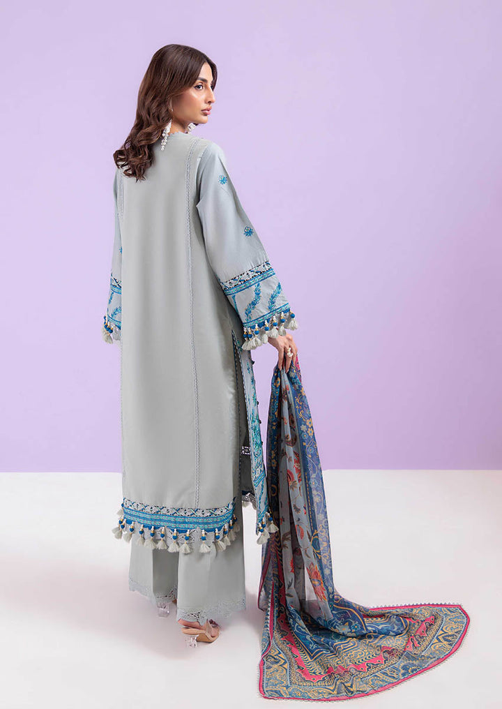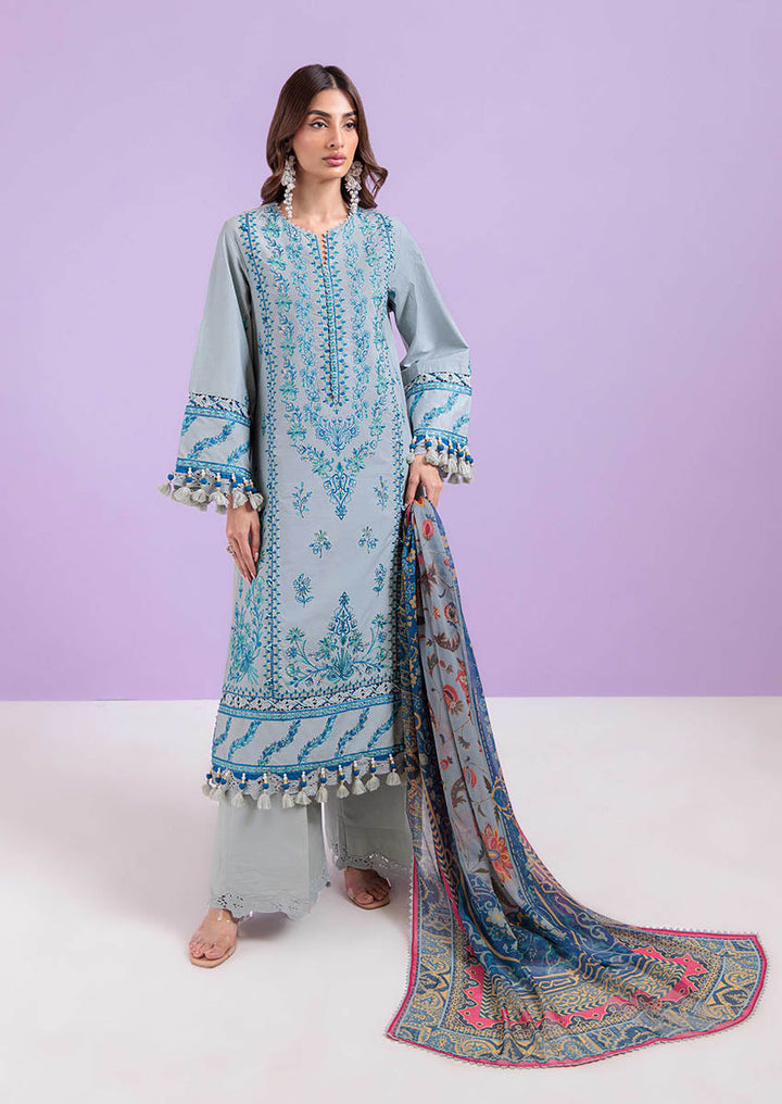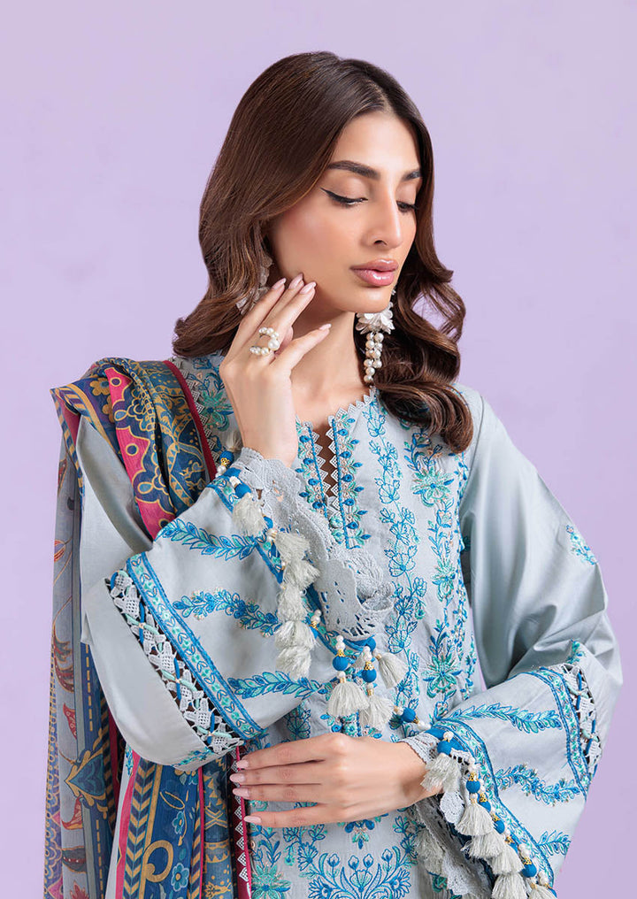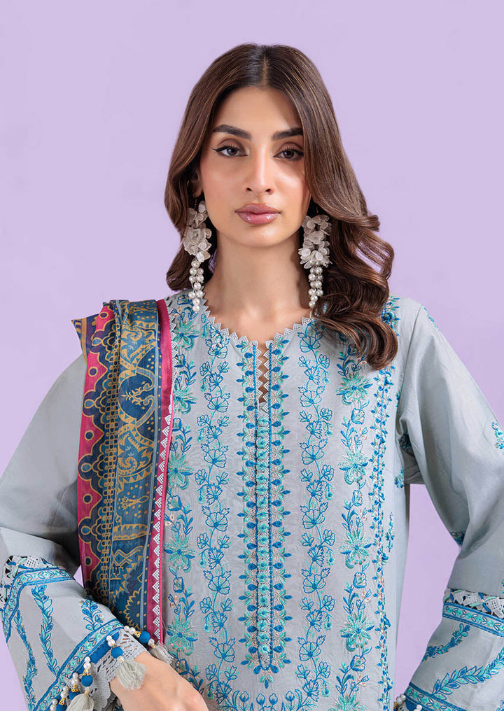 Inspired by the elegance of traditional pottery, this unstitched ensemble in a serene sage hue channels the charm of hand-crafted ceramics. The shirt is adorned with delicate, tile-like motifs and ornamental borders that echo the grace of painted pottery. Accents of cobalt and coral on the dupatta introduce contrast while maintaining the overall artisanal aesthetic. A harmonious blend of texture, craft, and culture—designed for the woman who appreciates timeless detail.