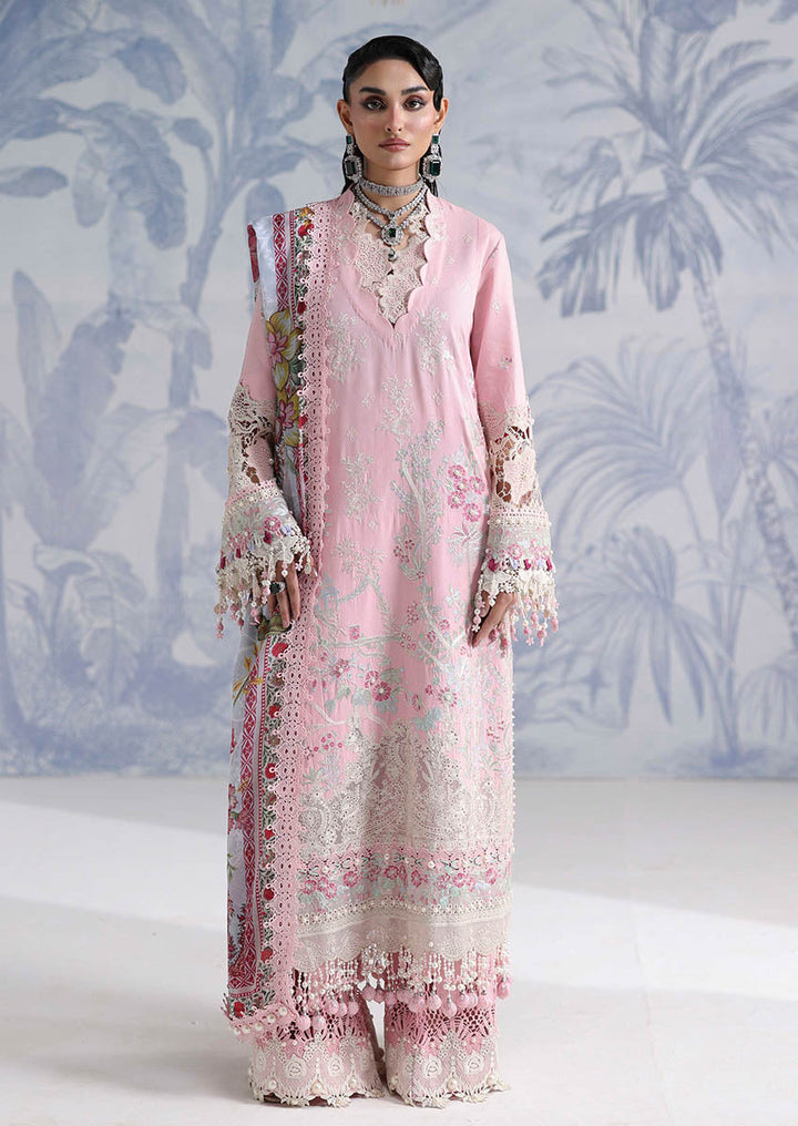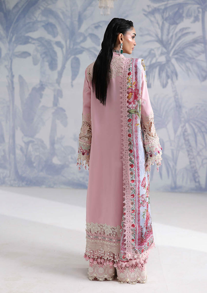 This unstitched ensemble reimagines the elegance of kimonos through a contemporary lens, where delicate chinoiserie motifs bloom across pink canvas. Intricate embroidery, scalloped neckline, and ornate lace details add a refined grace, while the soft printed dupatta in icy pastels complements the serene sophistication of the outfit. A perfect blend of tradition and modern artistry.
