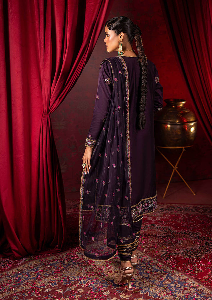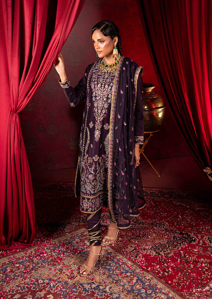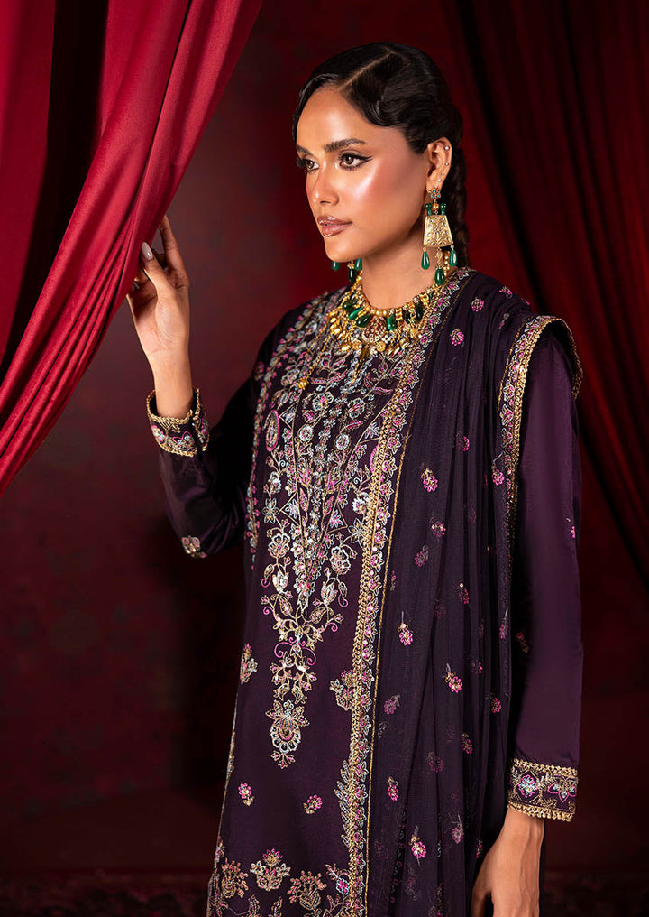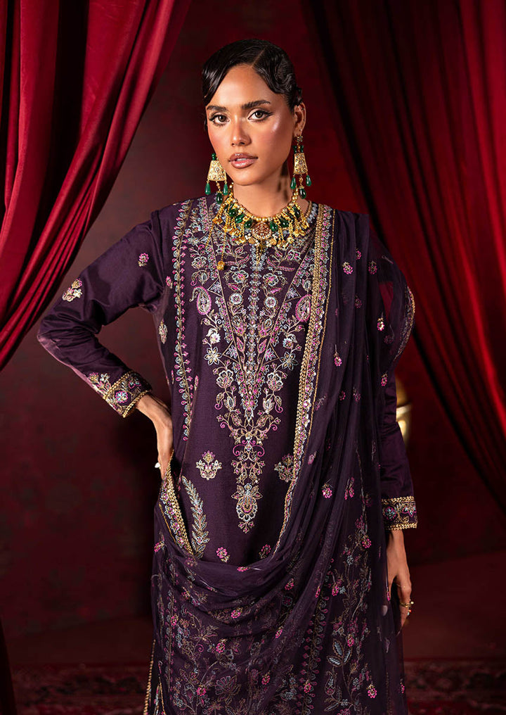 Drenched in a rich purple hue, this unstitched ensemble channels the opulence of Victorian floral artistry with an ornate Eastern spirit. The shirt is adorned with intricately rendered botanical motifs in soft lilacs, mints, and antique golds—framing the silhouette with baroque-inspired borders and a regal neckline. Paired with an embellished dupatta and detailed trousers, this look is designed for those who carry a timeless grandeur in every step.