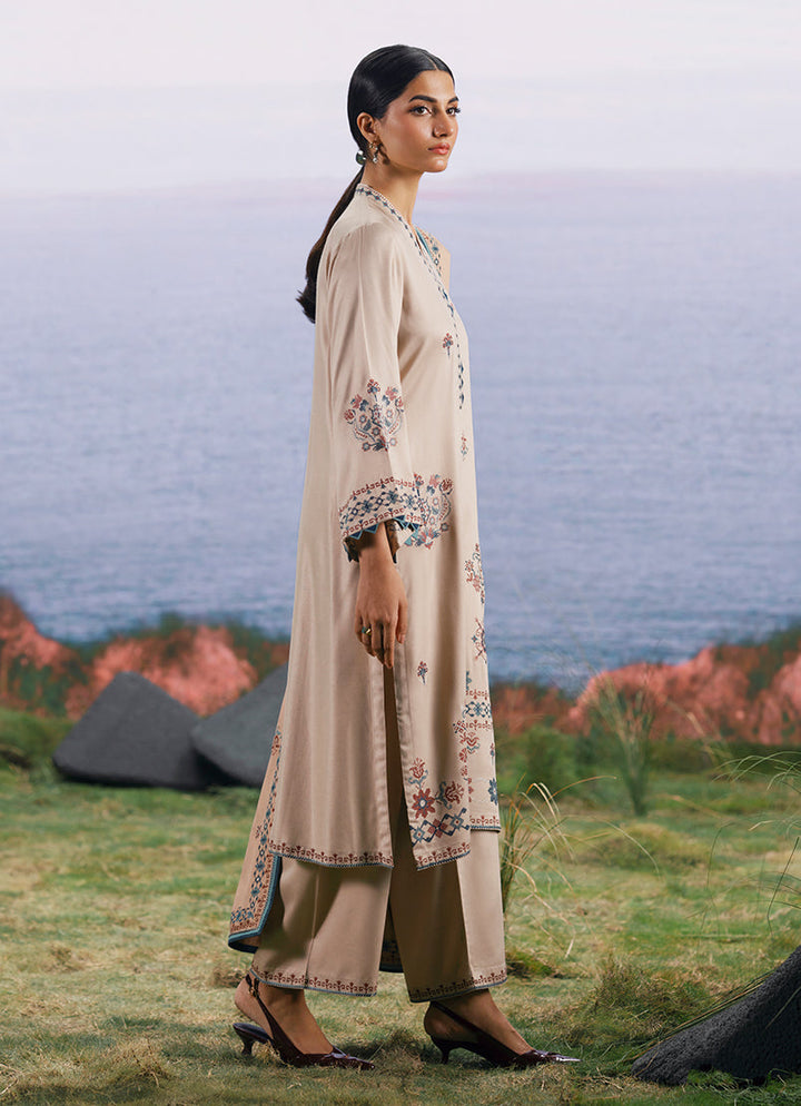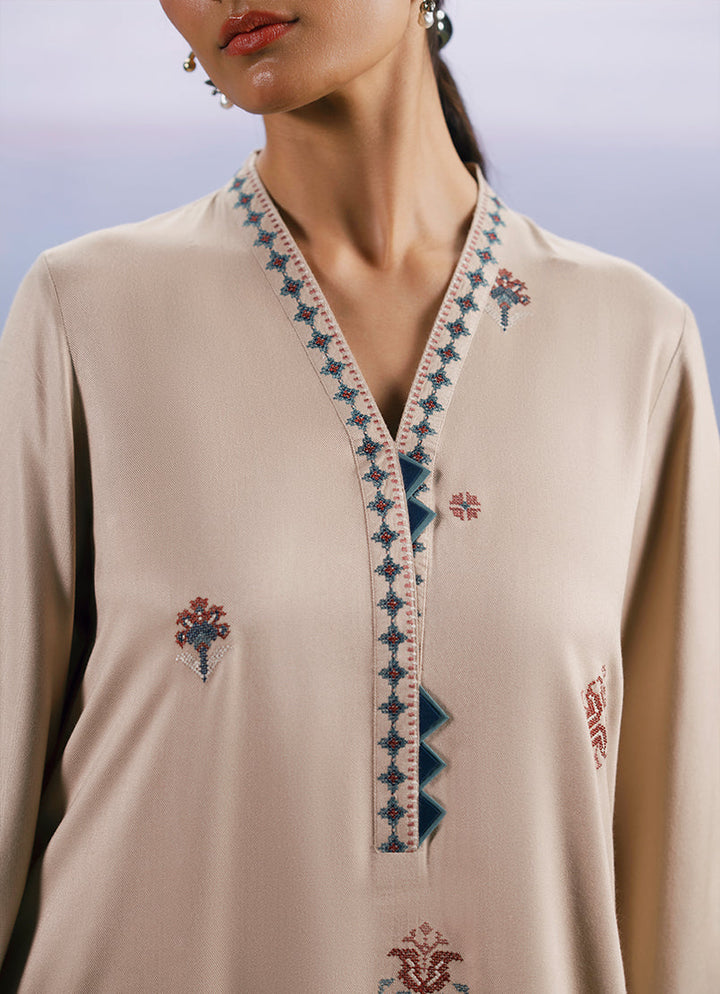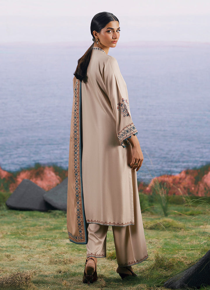 Yasira in Beige/Oat Beige from our Winterkari '25 Collection. An embroidered twill viscose 3pc unstitched outfit.