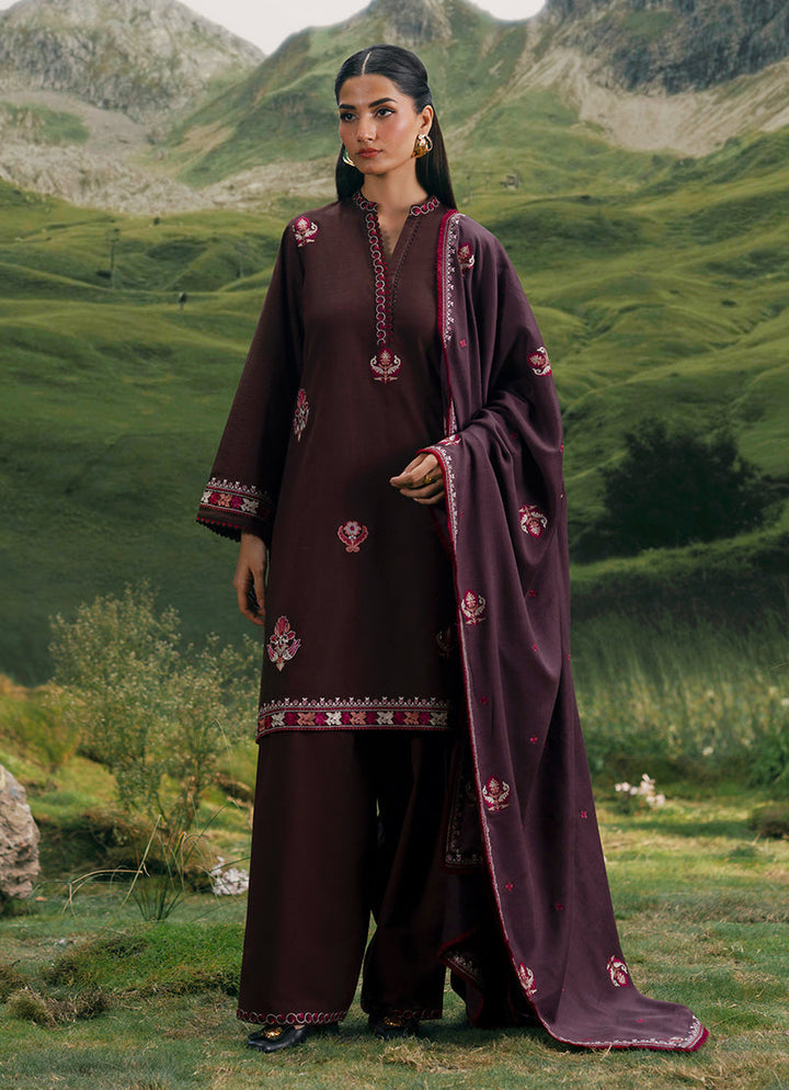 Zerreen in Dark Brown from our Winterkari '25 Collection. An embroidered khaddar 3pc unstitched outfit paired with khaddar trousers & an acrylic shawl.